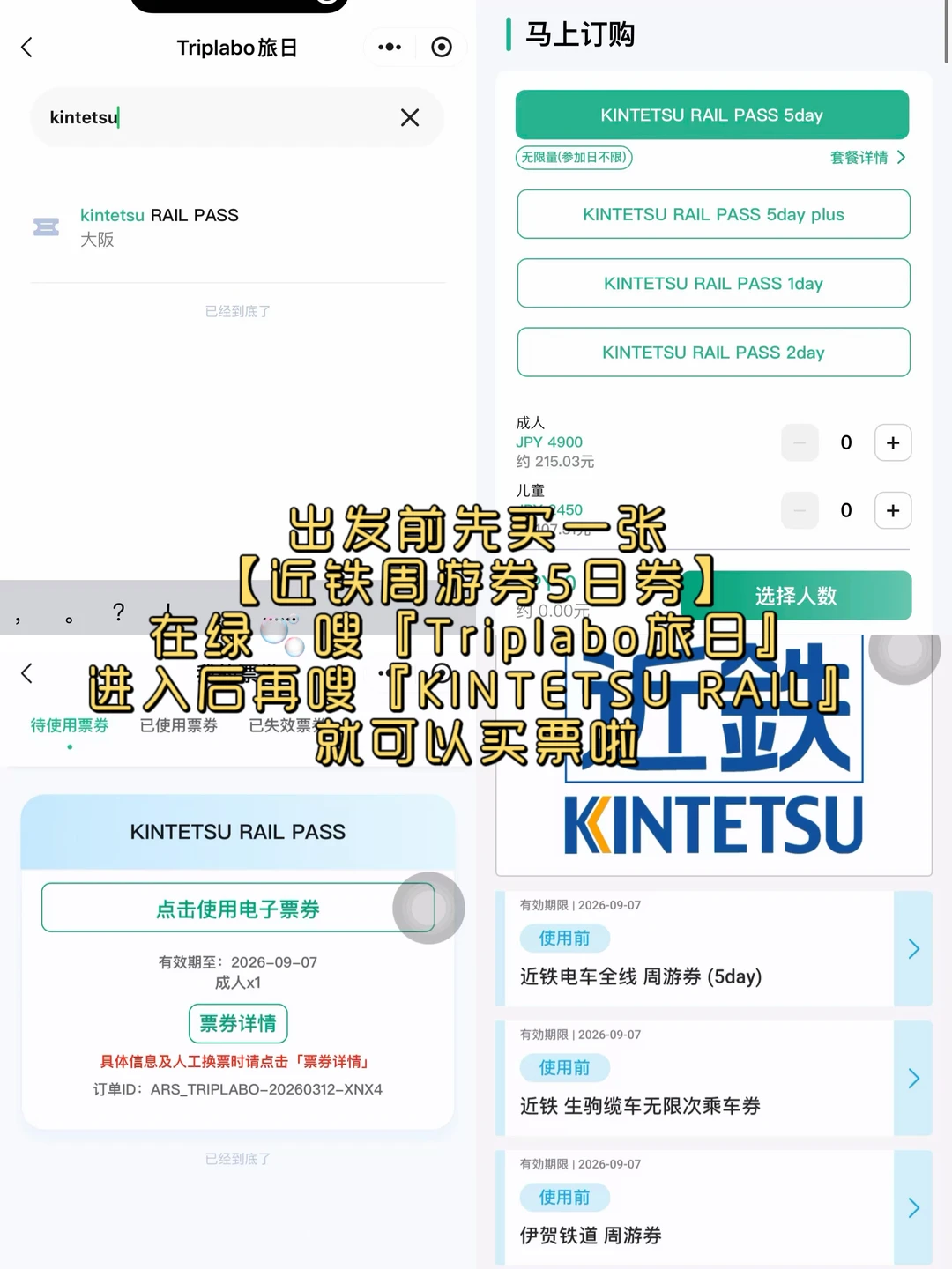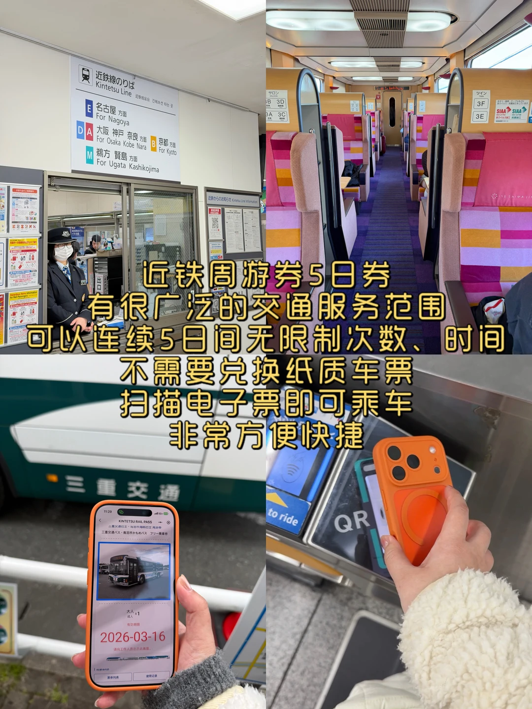 ②出发前先买好一张近铁周游券5日券(KINTETSU RAIL PASS 5 DAY PLU),覆盖大阪/京都/奈良/名古屋/伊势志摩等地区,除了在伊势志摩玩了2天,后续还在大阪京都玩了3天,买近铁周游券5日券PLUS版超级划算。近铁电车随便坐,且连续5日间无次数和时间限制。大家可以在小🍊xu【旅日】上入手,不用换票,直接电子票即可乘车,非常方便。如果要坐特急,额外买一下特急券就可以了。