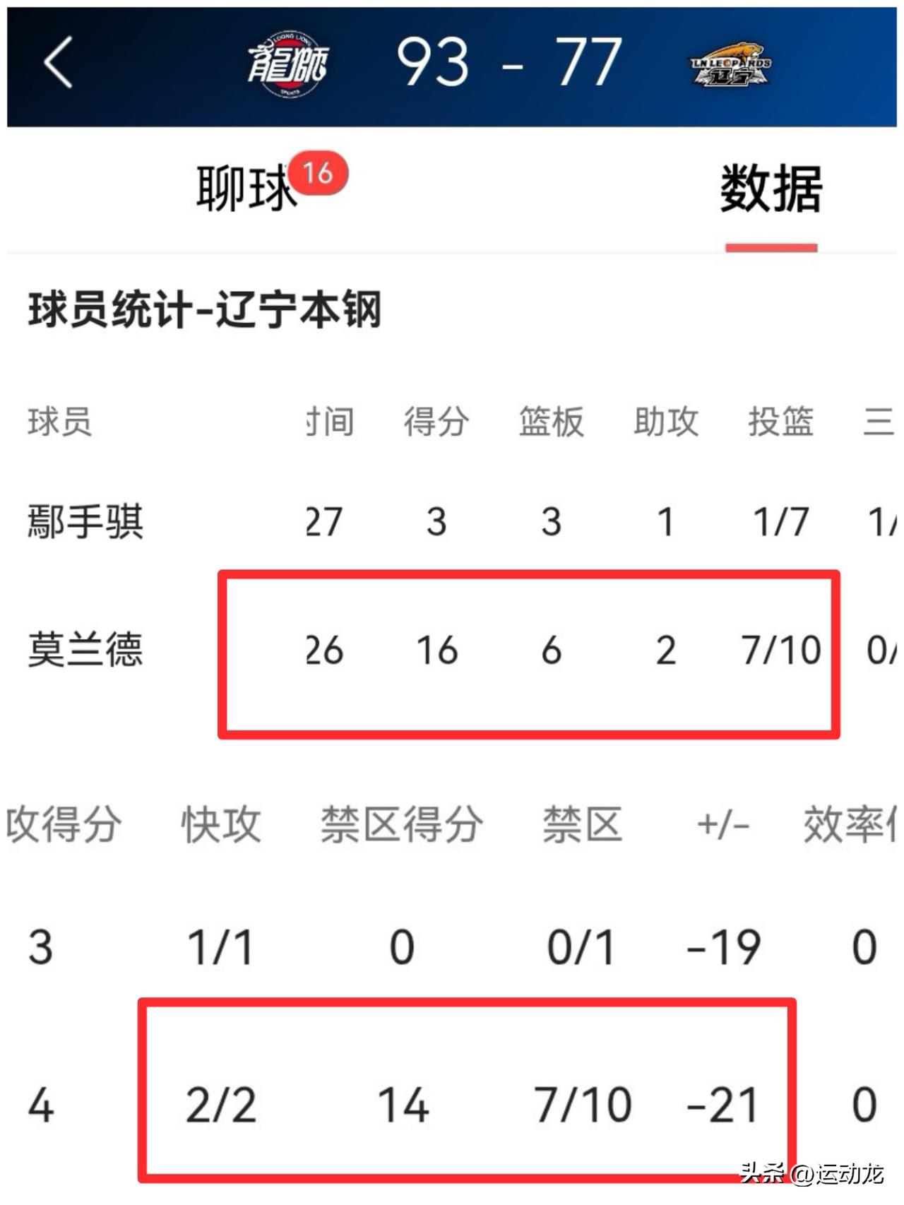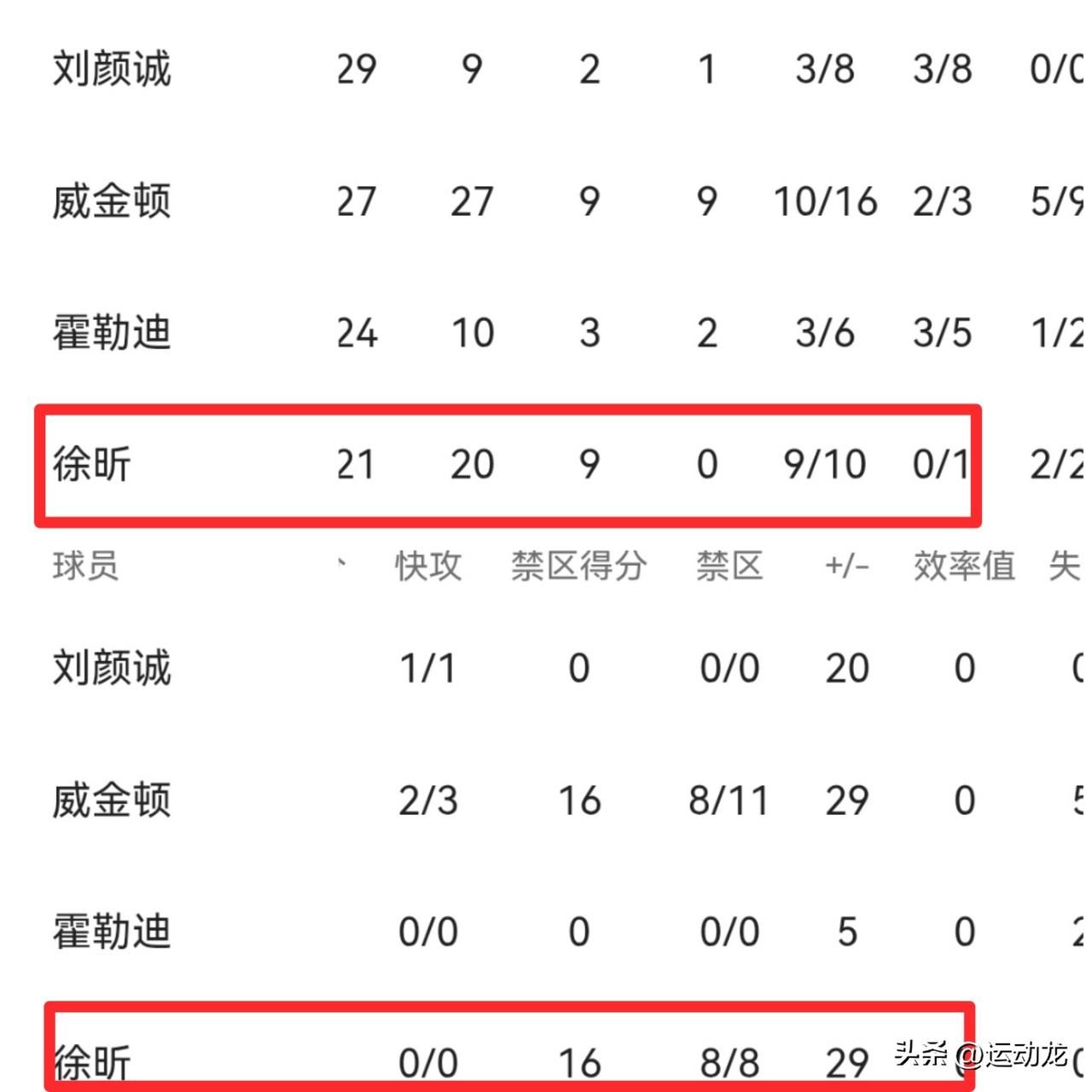 徐昕打爆莫兰德,本土2米26中锋成名之战! 数据对比(前徐昕后莫兰德): 出场时间:21分钟:26分钟 得分: 20:16 禁区得分:16:14 篮板球: 9:6 投篮命中率:90%:70% 正负值: + 29 : -19 五项个人数据对比,徐昕全胜!