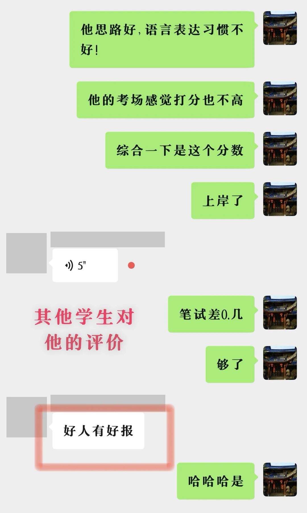 ❣️他的优势是思路非常清晰,能听的明白,也能讲的通透,听说后期在地面班陪很多同学练习。但是劣势也很明显,语速很快,降不下来,没有语音语调。这个东西太难改了,他用自己的优势思路和词汇,拉平了劣势。笔试第二差第一零点几分,面试虽然不高只有84.3分,但高面试第二3.3分,完全够用了。最后一张图是他介绍来的学生,对他的评价,听说明年他地面班的老师也邀请他去做助教。