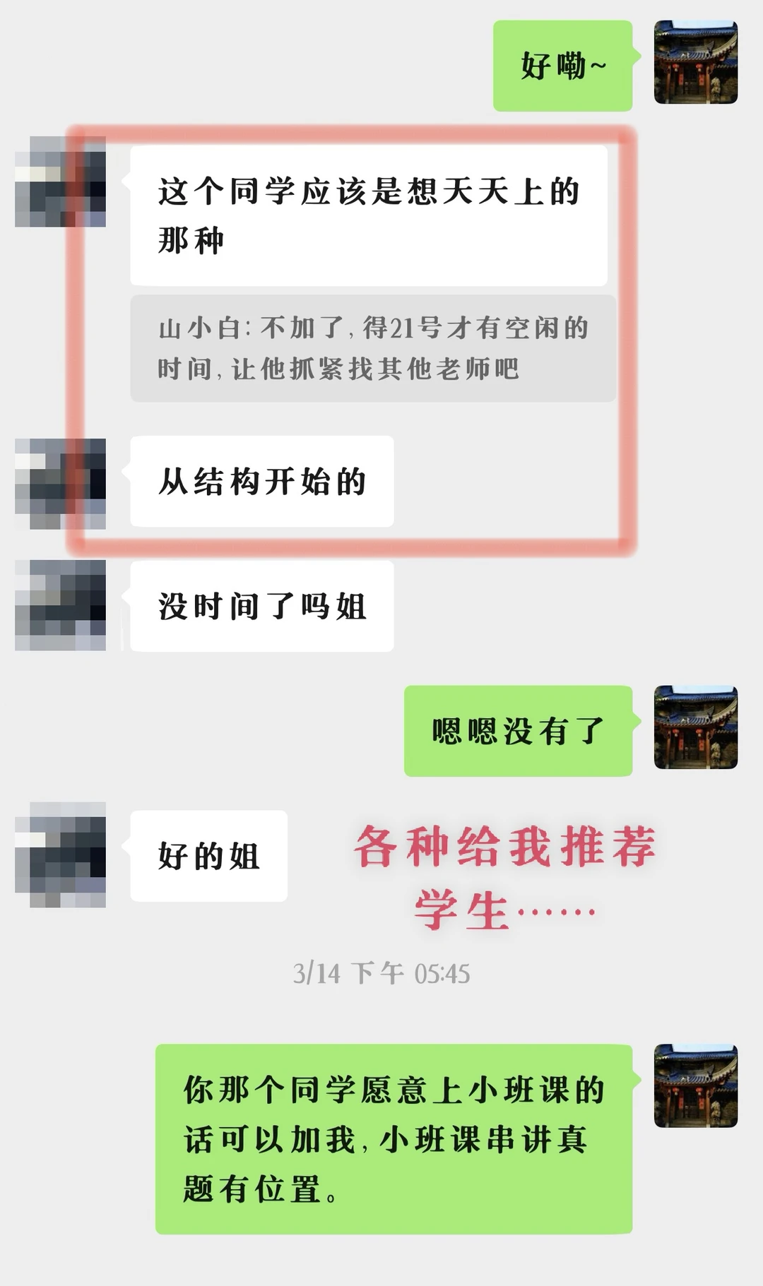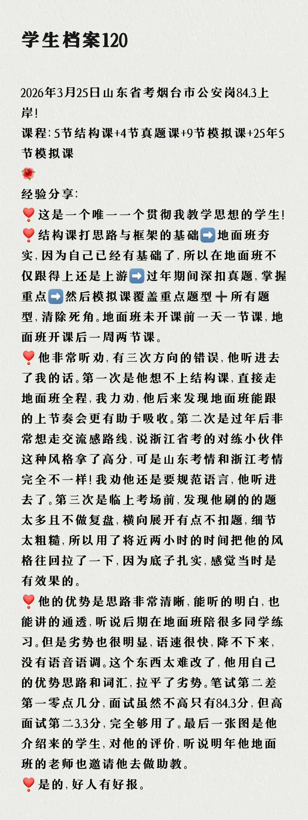 ❣️他非常听劝,有三次方向的错误,他听进去了我的话。第一次是他想不上结构课,直接走地面班全程,我力劝,他后来发现地面班能跟的上节奏会更有助于吸收。第二次是过年后非常想走交流感路线,说浙江省考的对练小伙伴这种风格拿了高分,可是山东考情和浙江考情完全不一样!我劝他还是要规范语言,他听进去了。第三次是临上考场前,发现他刷的的题太多且不做复盘,横向展开有点不扣题,细节太粗糙,所以用了将近两小时的时间把他的风格往回拉了一下,因为底子扎实,感觉当时是有效果的。