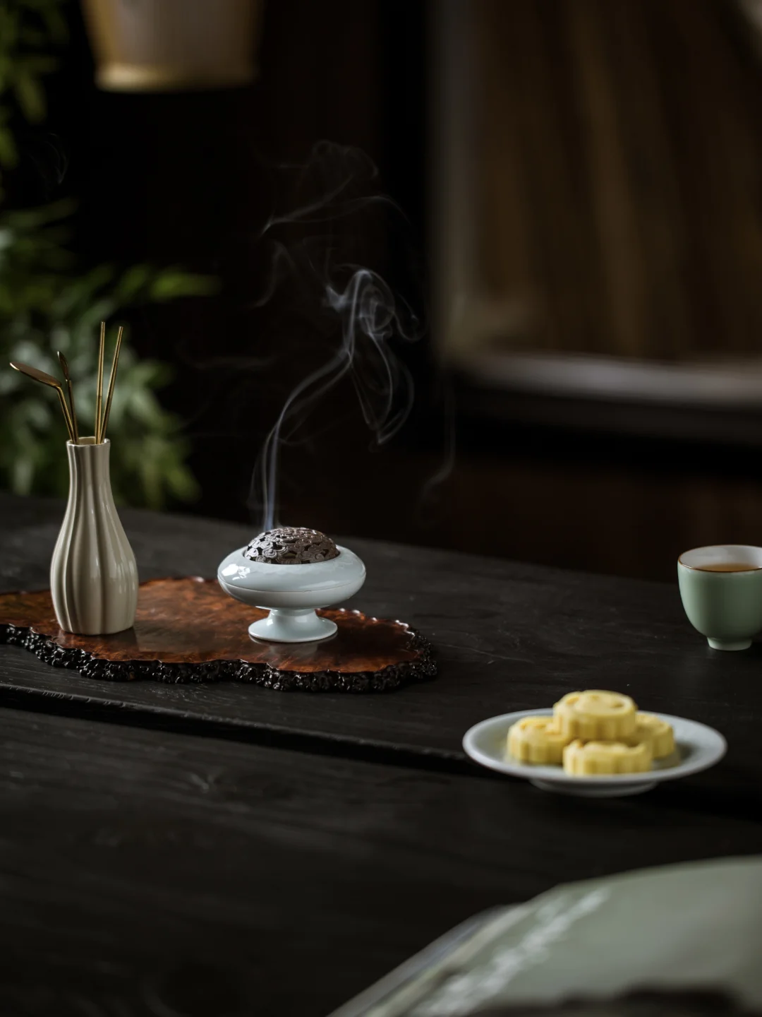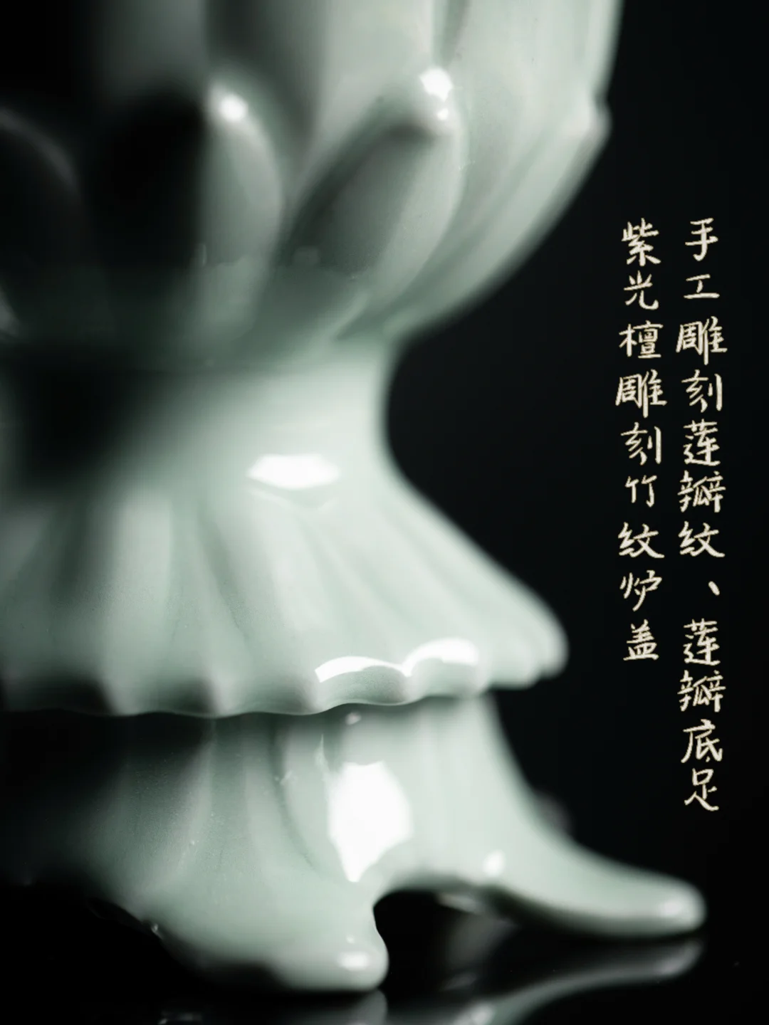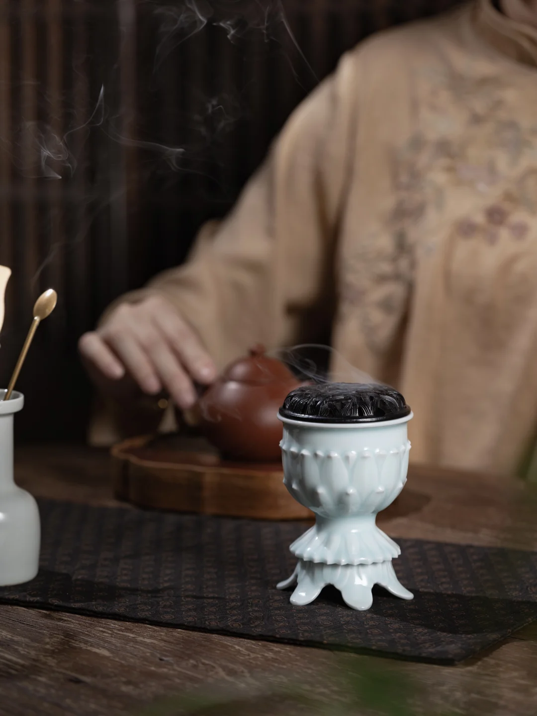 莲瓣的炉身,竹节的足,影青的釉色清透得像带着露珠。点一炉香,烟从紫光檀的炉盖上升起,与空气中的水汽缠在一起,分不清是烟是雾。