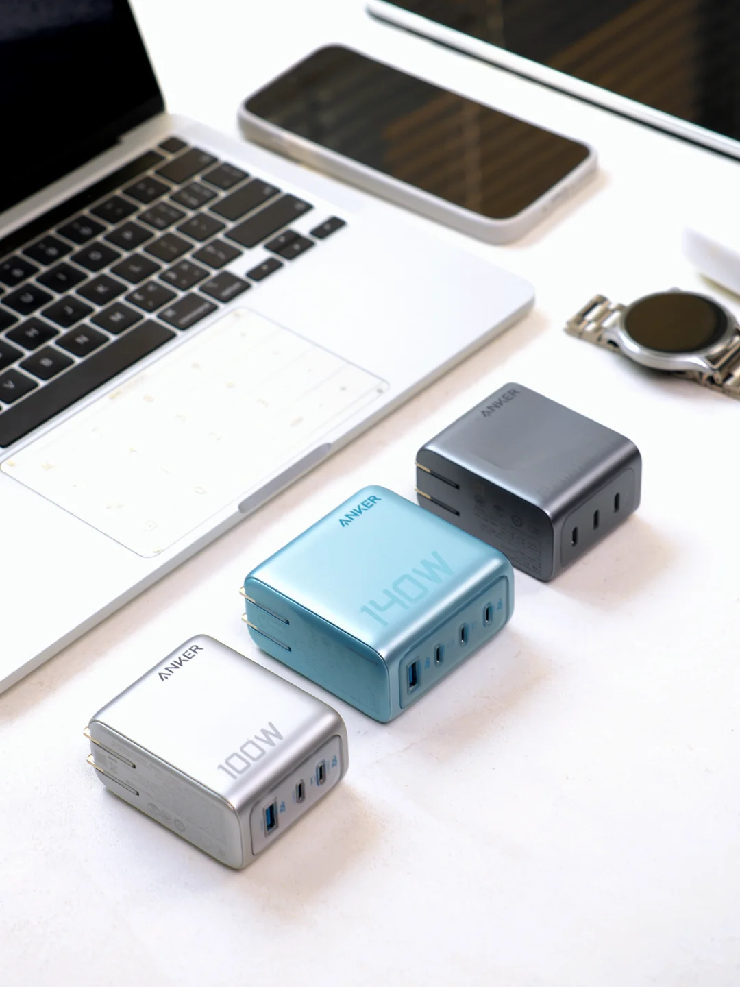 建议:高性能的多口充电器,更大的 140W 功率,更多的 3C1A 接口,可以给游戏本、Macbook Pro、专业无人机等高性能设备充电,适合固定工位办公或者快节奏的打工人