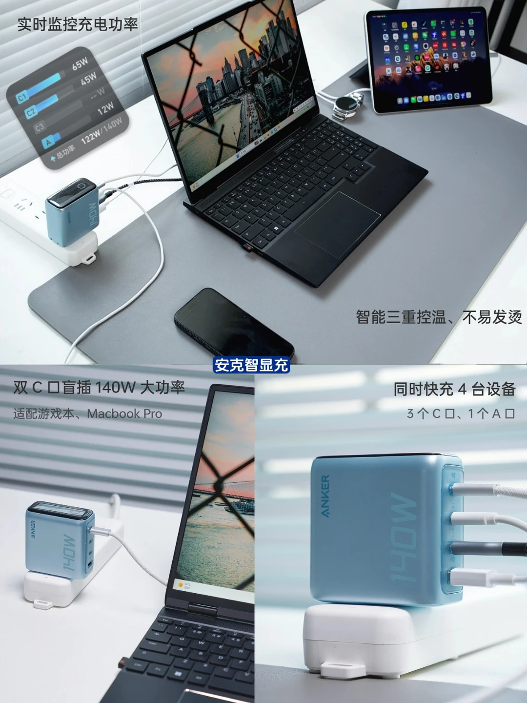 建议:极致高效率的多口充电器,3 个 C 口,单口可以 24h 不降档的140W 供电。三口还能实时智能分配功率、也可以 APP 手动分配的极致充电效率,适合数码极客玩家
