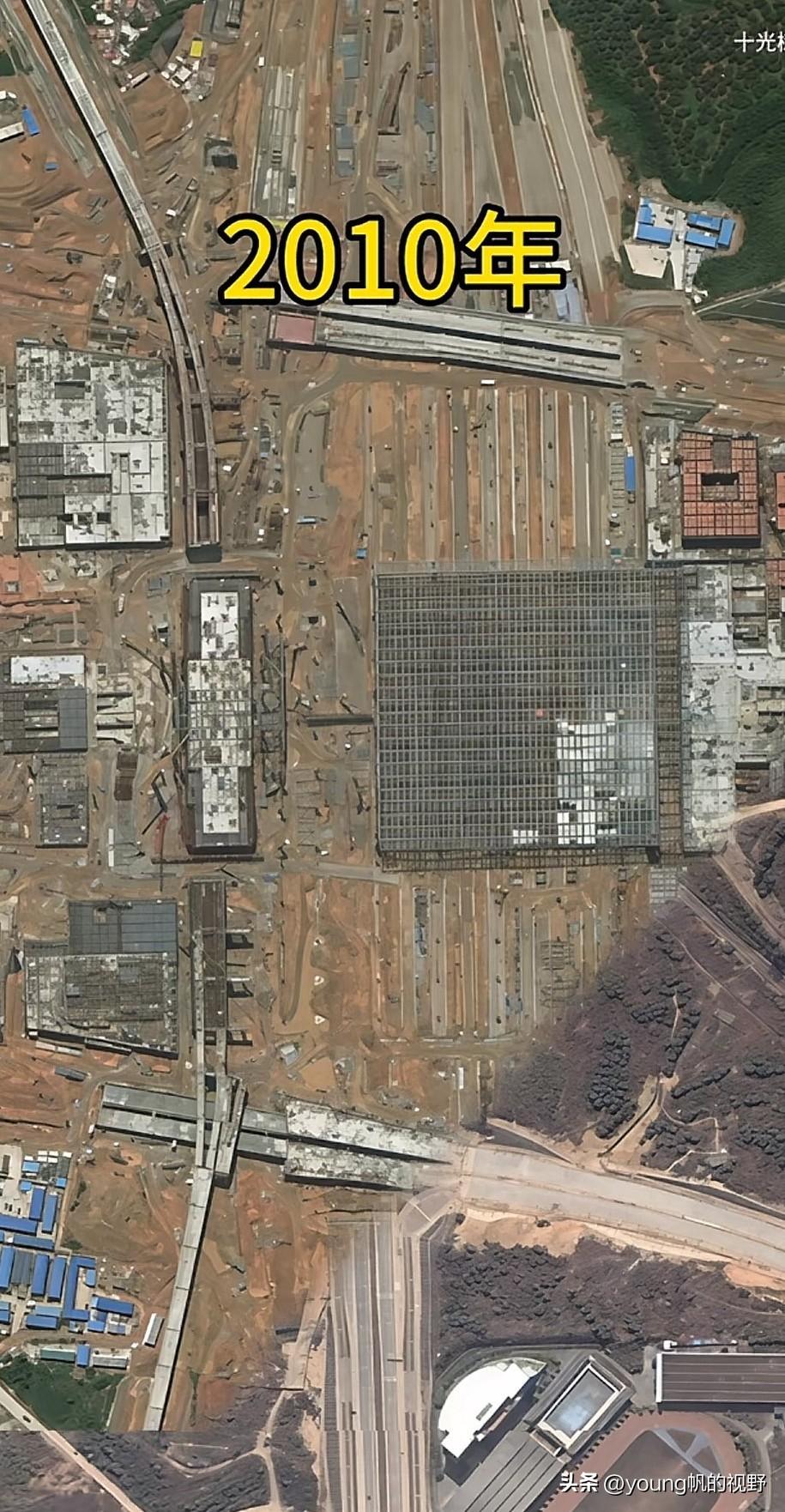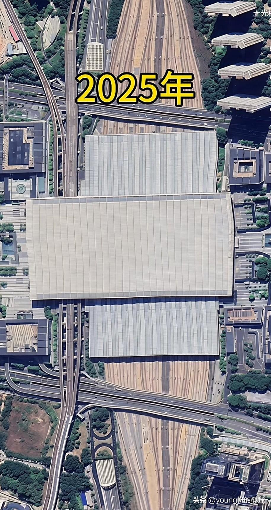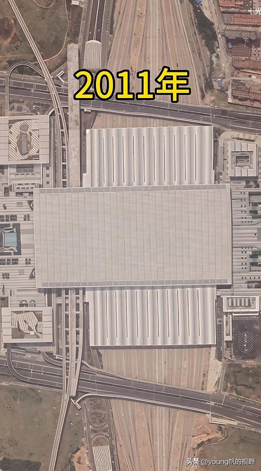 卫星拍摄照片显示的深圳北站所在地2008年至2025年发生的变化。2008年的时候,深圳北站所在位置还是一大片的丘陵地貌,只有一条平南铁路和为数不多的市政道路。到了2010年的时候,连带高铁站在内,周围一大片区域成了热闹的施工场地。铁路轨道和高铁的站房以及旁边地铁的高架桥都已经露出了初步的雏形。到了2011年的时候,广深港高铁广深段通车,深圳北站也同时启用。再到最近的2025年影像,以深圳北站为中心,周边也已经发展成了很成熟的城市环境。上述卫星图片也很好的反映了深圳城市的变化。