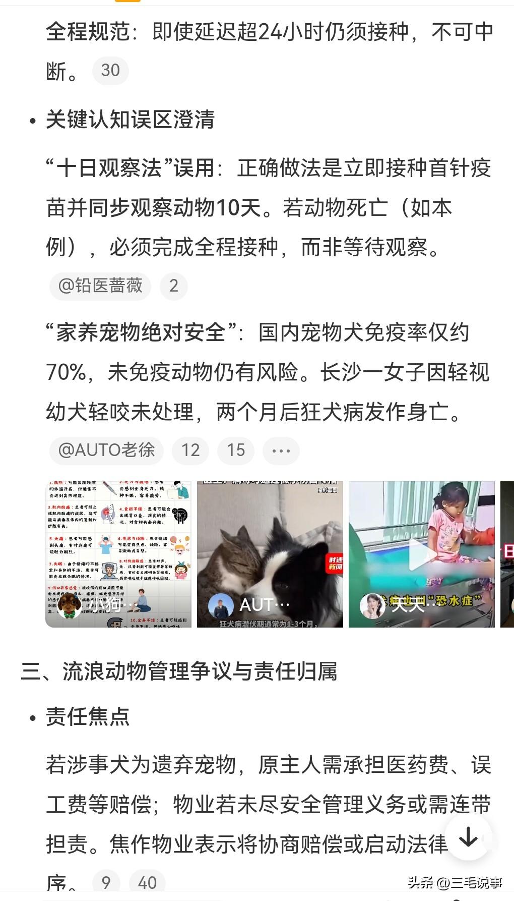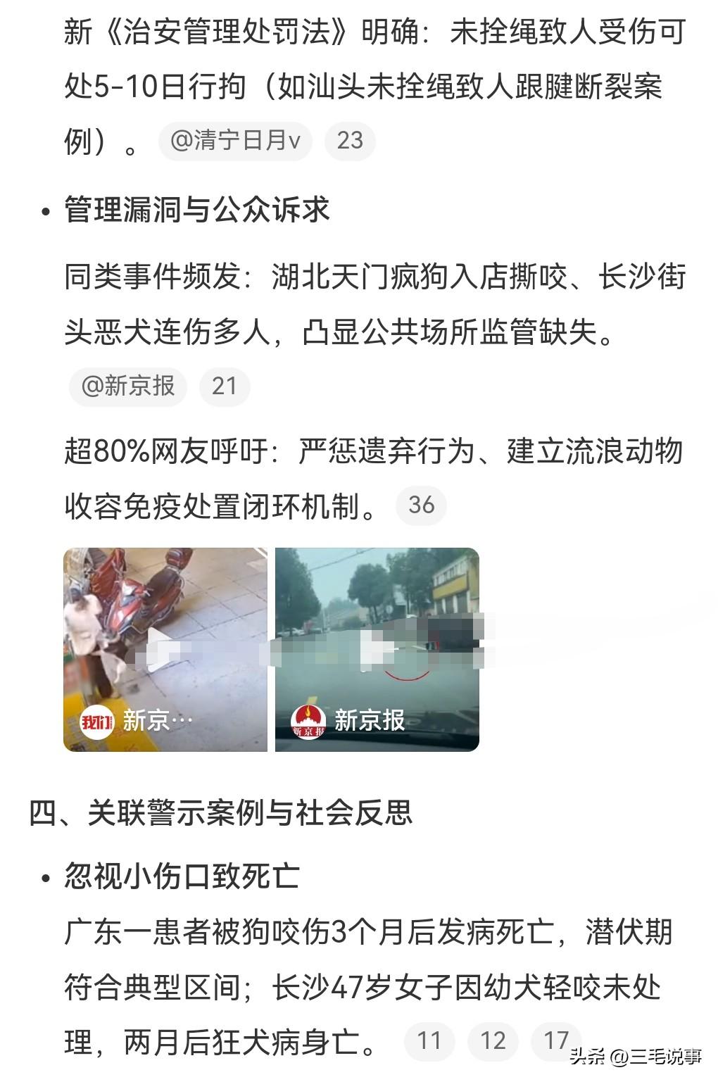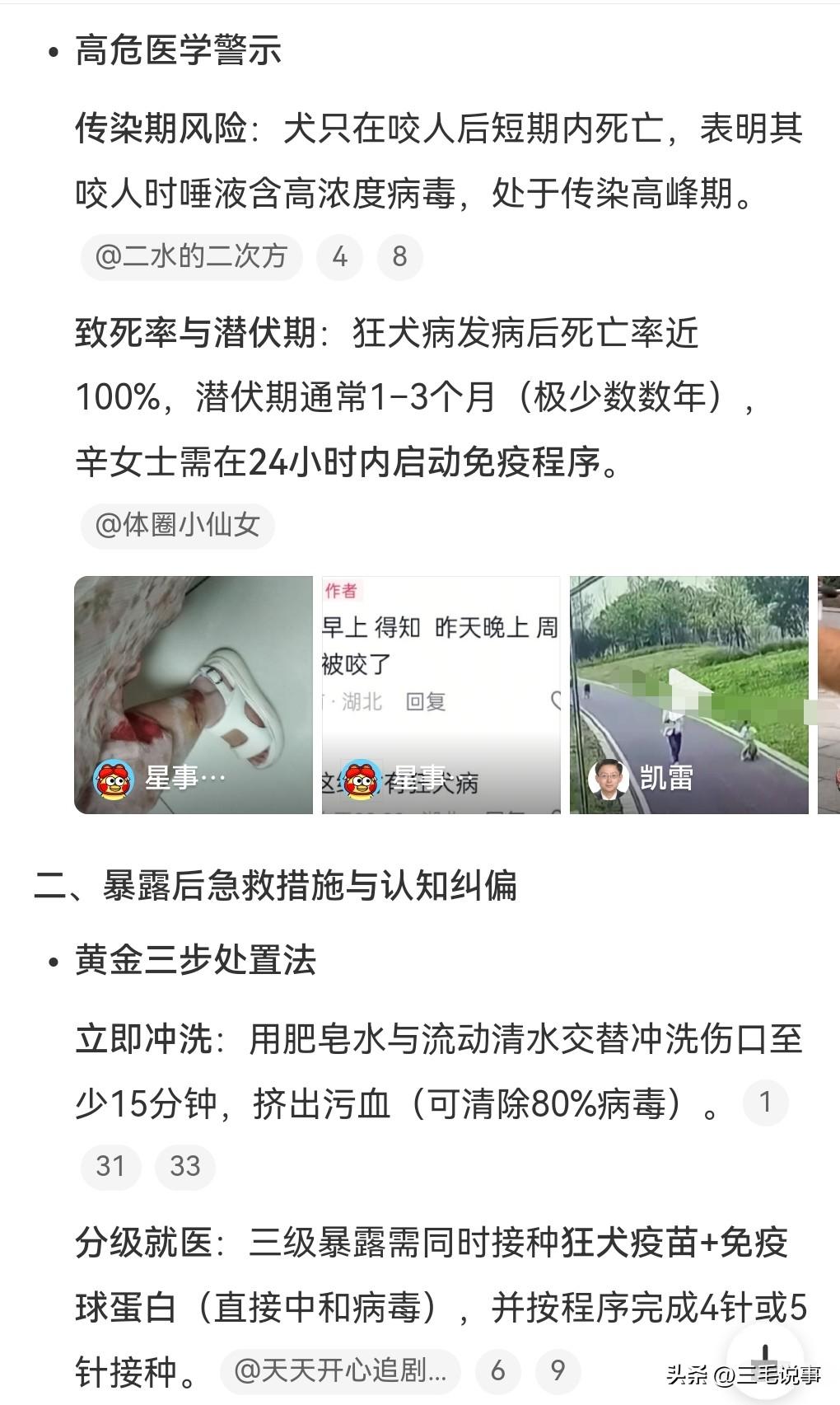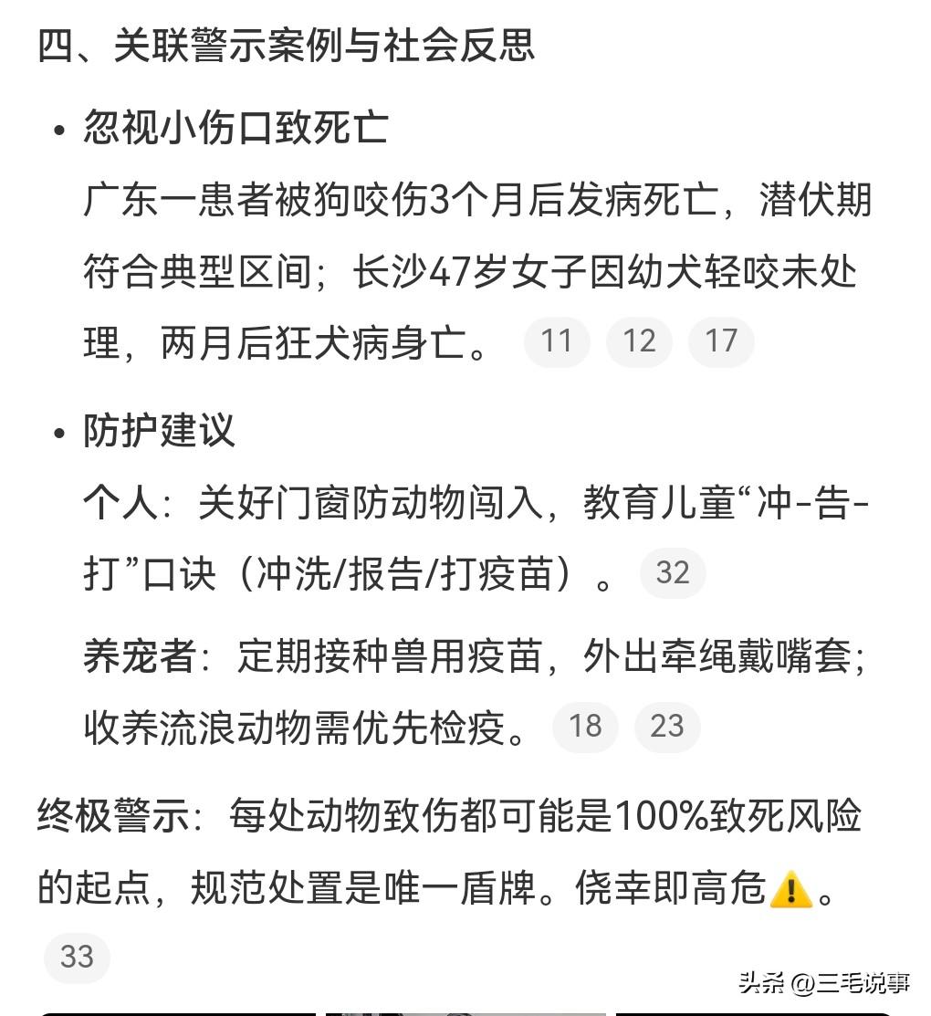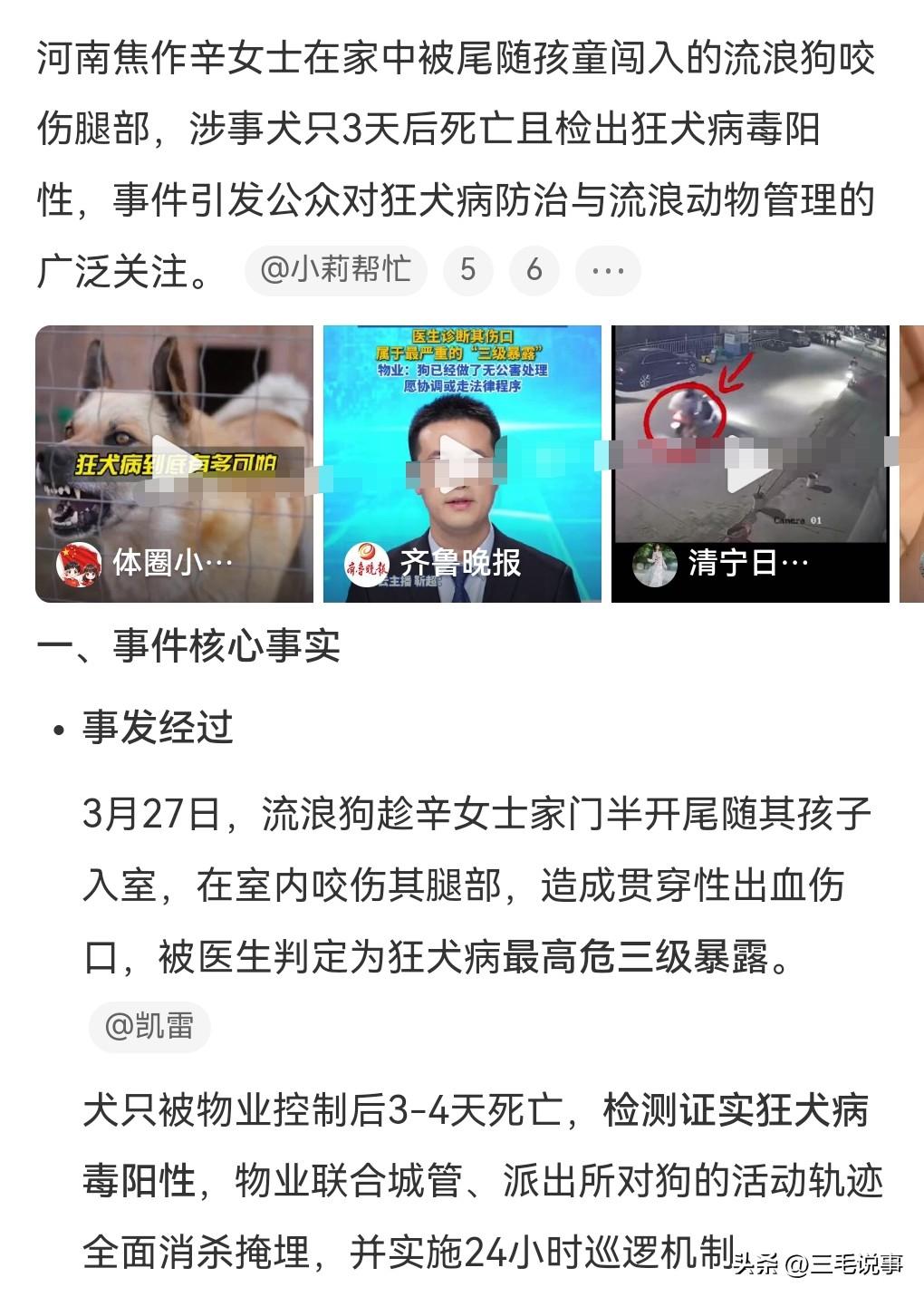 3月28日热搜,女子在家被流浪狗咬伤,3天后狗死了。这是发生在河南焦作,有一个狗尾随孩子进了屋,这真是太危险了,咬了一名女子的腿。狗被控制后三四天就死了,还查出狂犬病。医生提醒,像这种贯穿伤出血是高危情况,被狗咬伤后要用肥皂化水和清水冲洗15分钟以上。这种病实在是太可怕了,竟然要清洗这么久,并且要尽快打狂犬病疫苗。 女子的情况是非常危险的,高危三级暴露。 狂犬病的可怕就在于病发后的死亡率接近100%。而且这个潜伏期也是让人防不胜防,通常1~3个月,极少数的甚至可以潜伏数年之久。 这条狗虽然是流浪狗,但是如果能找到原主人的话,那这个原主人肯定要赔偿的。流浪狗伤人的事情也是经常发生,见到流浪狗一定要绕着走。