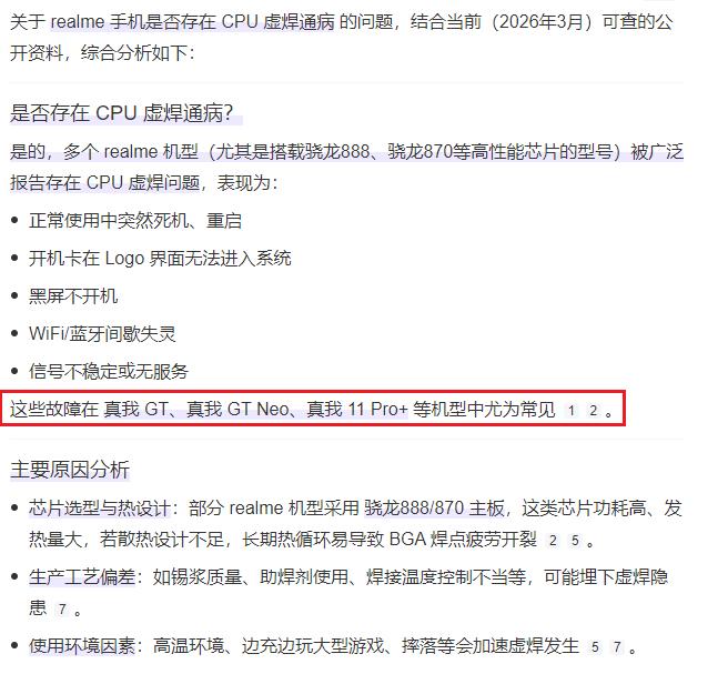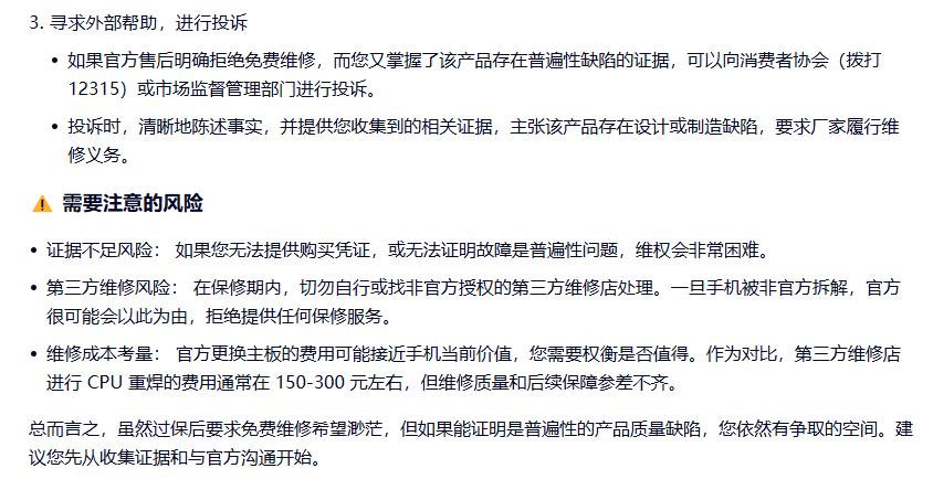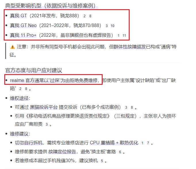 手机过保后还能争取要求厂家免费维修吗?正常情况下是不能,但如果这是厂家这一款手机的通病呢?我手头有两部realme gt neo的手机,都是过保了的,其中一部半年前突然自动重启开机后失败,一直重复重启,最后停留在恢复界面进不了系统,当时因为是知道过保了,所以是找了购买的平台付费维修了。前几天另一部同款手机也发生了同样的现象,我才意识到这可能是这款手机的通病。所以我特意上网查询了资料,发现这个品牌的前期gt型号的手机确实存在这个cpu虚焊的通病,网上有维修数码的博主也在谈到这个问题,这是这个品牌手机几款手机的通病,解决方法就是cpu重植!明眼人都应该得看出来,如果这是通病,那证明是这款手机在设计或出厂的时候就存在问题,厂家是需要召回维修的,而不是等到过保后就不理。 然而网上看了很多资料,realme厂家基本是拒绝免费维修这个问题的。 现在的问题就是,在我国的法律中,确实是过保后的手机就不再免费维修!但法律有没有规定如果是厂家产品设计的问题导致cpu虚焊在某款机型上容易发生,那是否应该回收去维修呢?不然这问题一发生,用户不愿意付高费用维修的话(毕竟维修费往往比二手机的价格还高),那手机上的资料就面临无法找回的境地。 为什么汽车厂家会对出厂就存在缺陷的汽车召回维修,而手机企业就没有这个做法呢?
