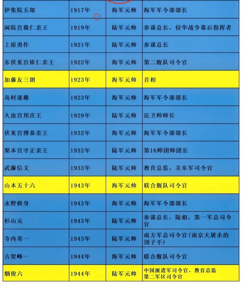山本五十六:海军元帅。被击毙。 杉 山 元:陆军元帅。自杀。 古贺峰一:海军元帅。空难死亡。 如图所示,从1894年甲午战争开始,日本就逐步实施了侵略中国的计划,到1945年投降,一共50余年时间里,先后有30头被授予元帅军衔。值得一提的就是两个海军元帅,山本五十六和古贺峰一,它们两人都1944年先后死亡,前者乘坐的飞机被美军击落,后者乘坐的飞机时遭遇台风而消失。两个都是罪大恶极,都得到了应有的惩罚。