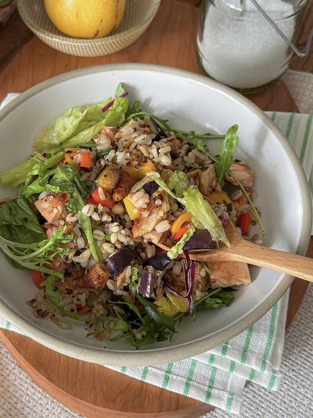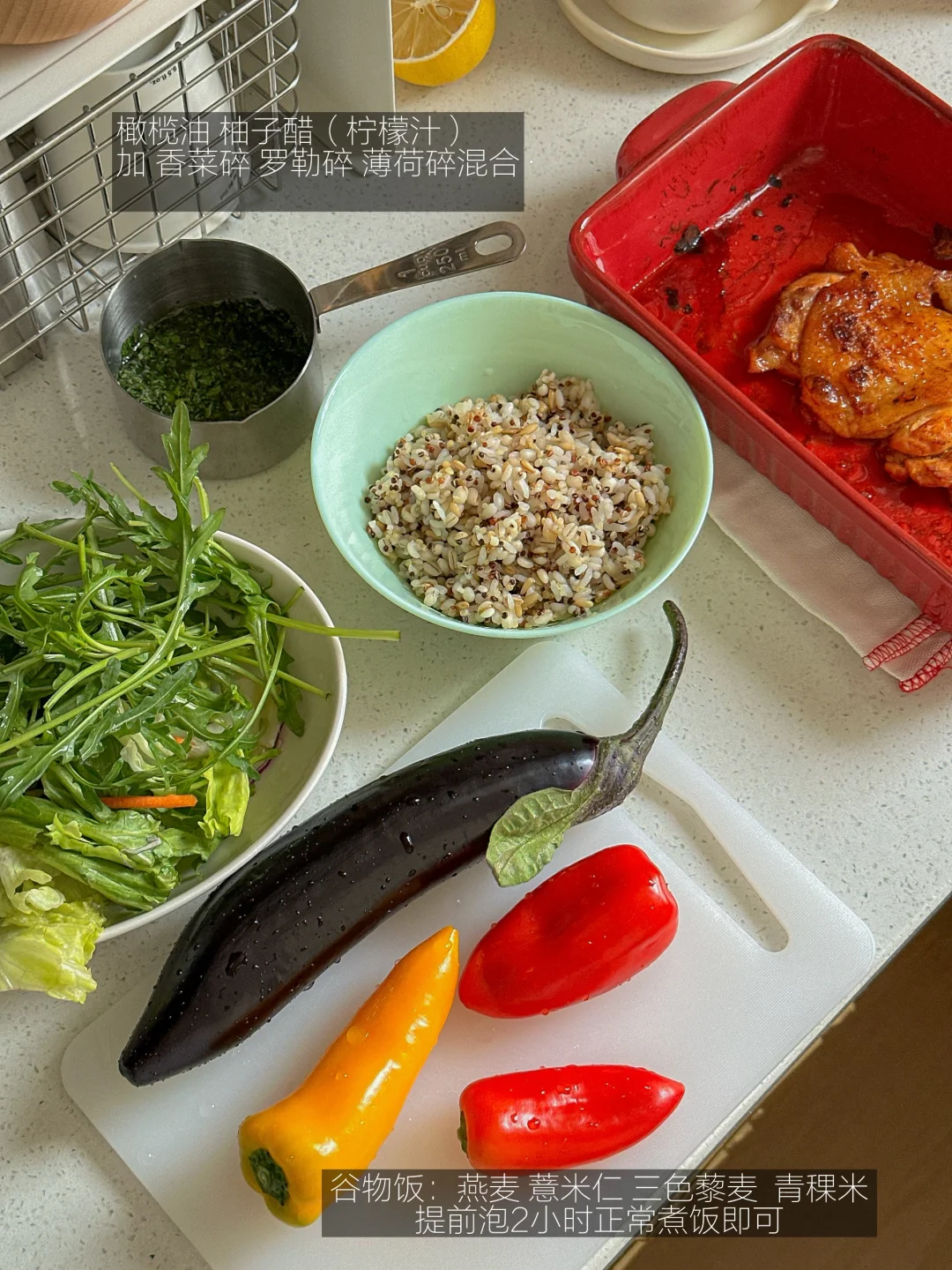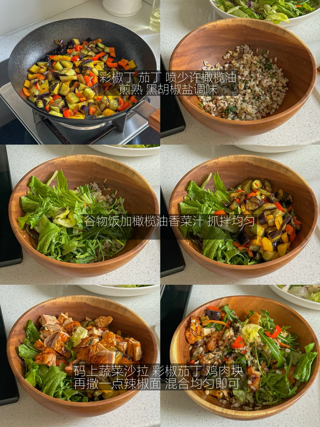煎茄丁🍆(一定要加)彩椒 各种沙拉蔬菜 焦嫩多汁的烤鸡肉块 多种谷物混合在一起 清爽中带有辣椒的调味(过瘾)!