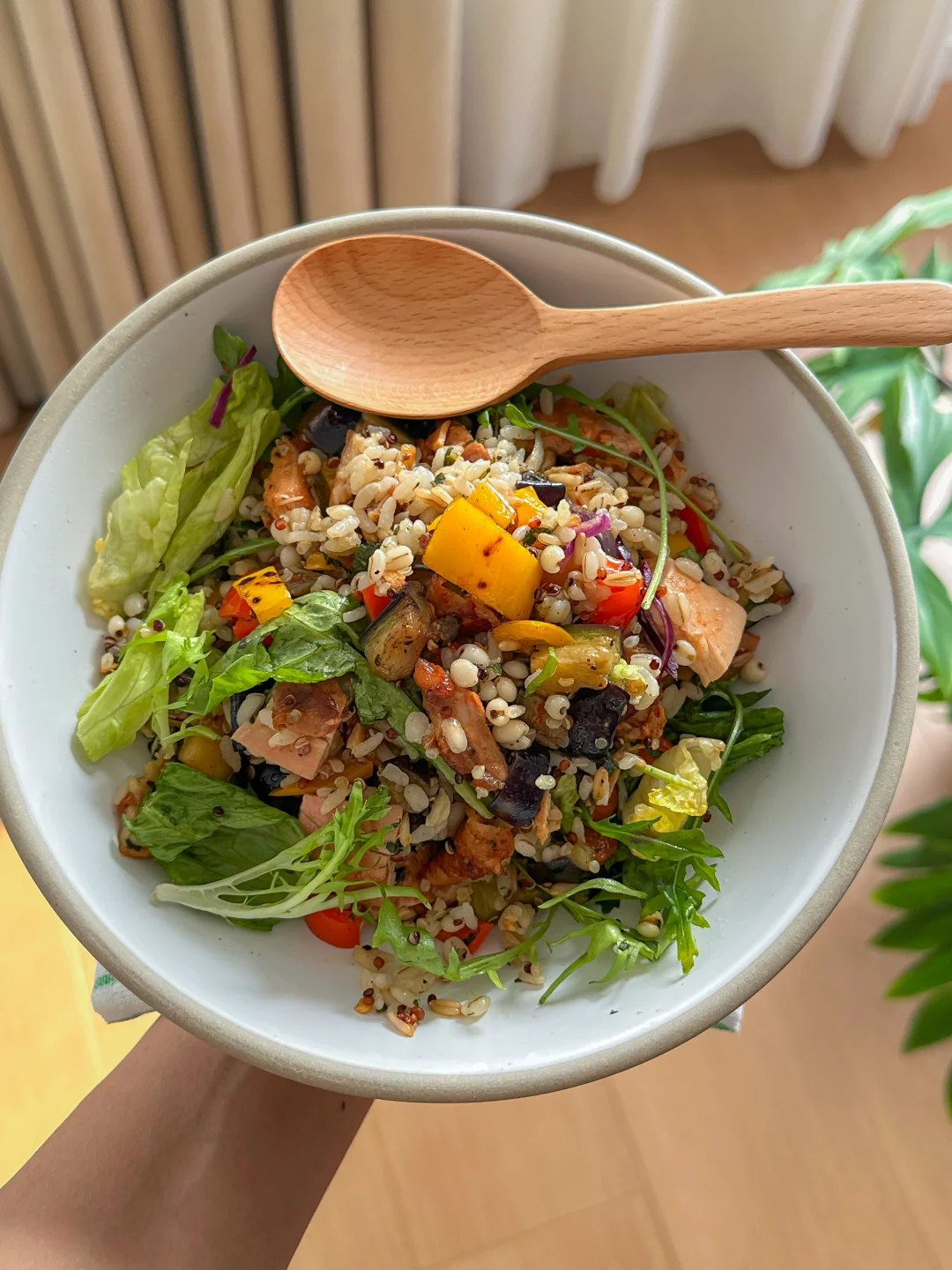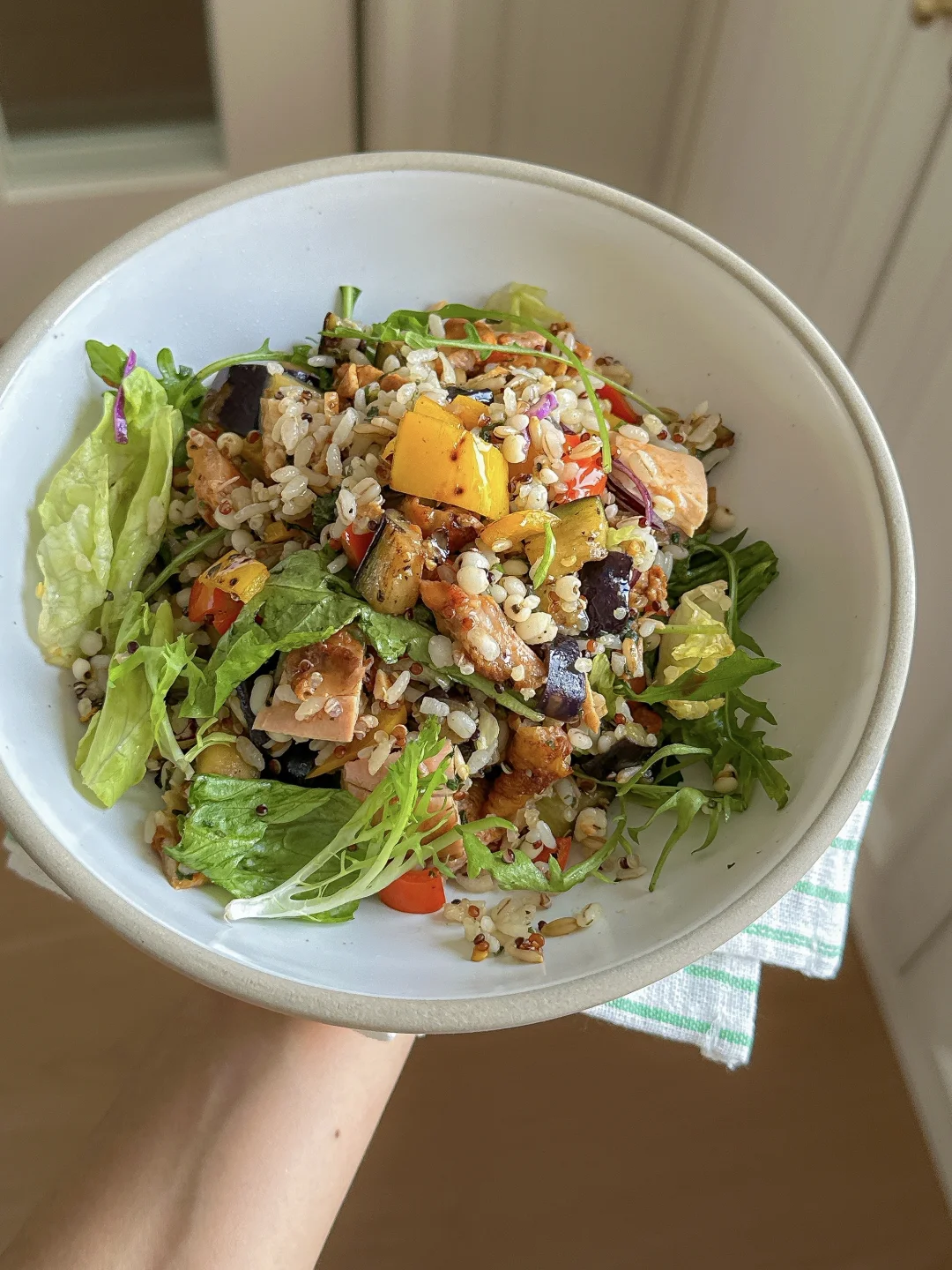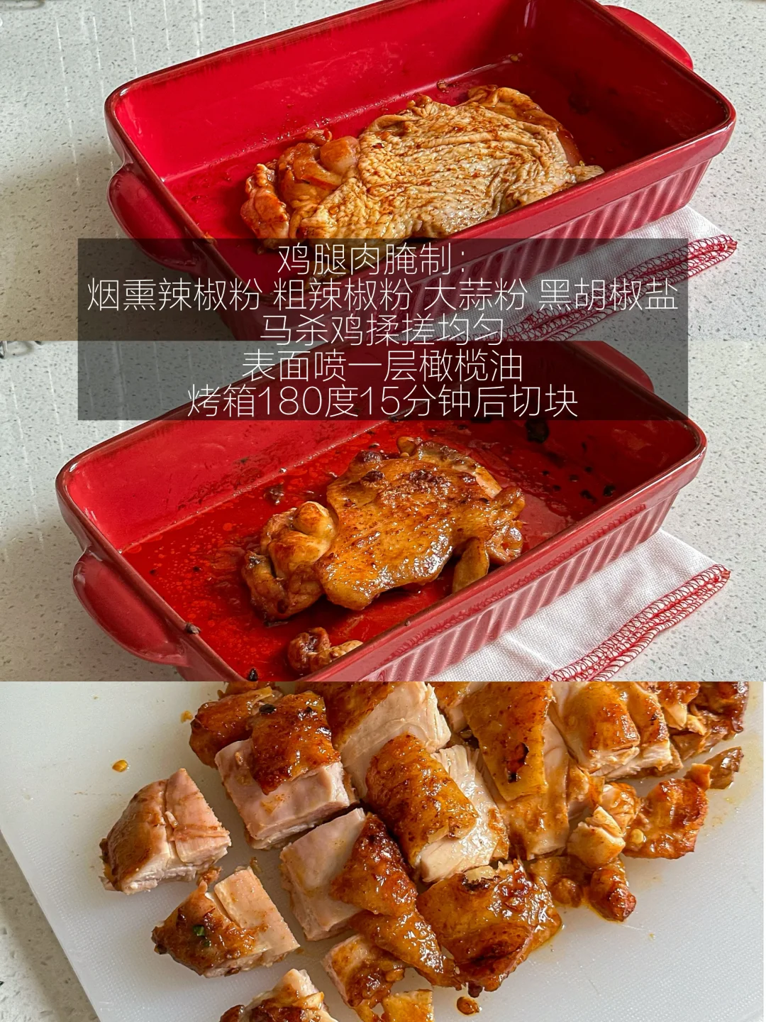 煎茄丁🍆(一定要加)彩椒 各种沙拉蔬菜 焦嫩多汁的烤鸡肉块 多种谷物混合在一起 清爽中带有辣椒的调味(过瘾)!
