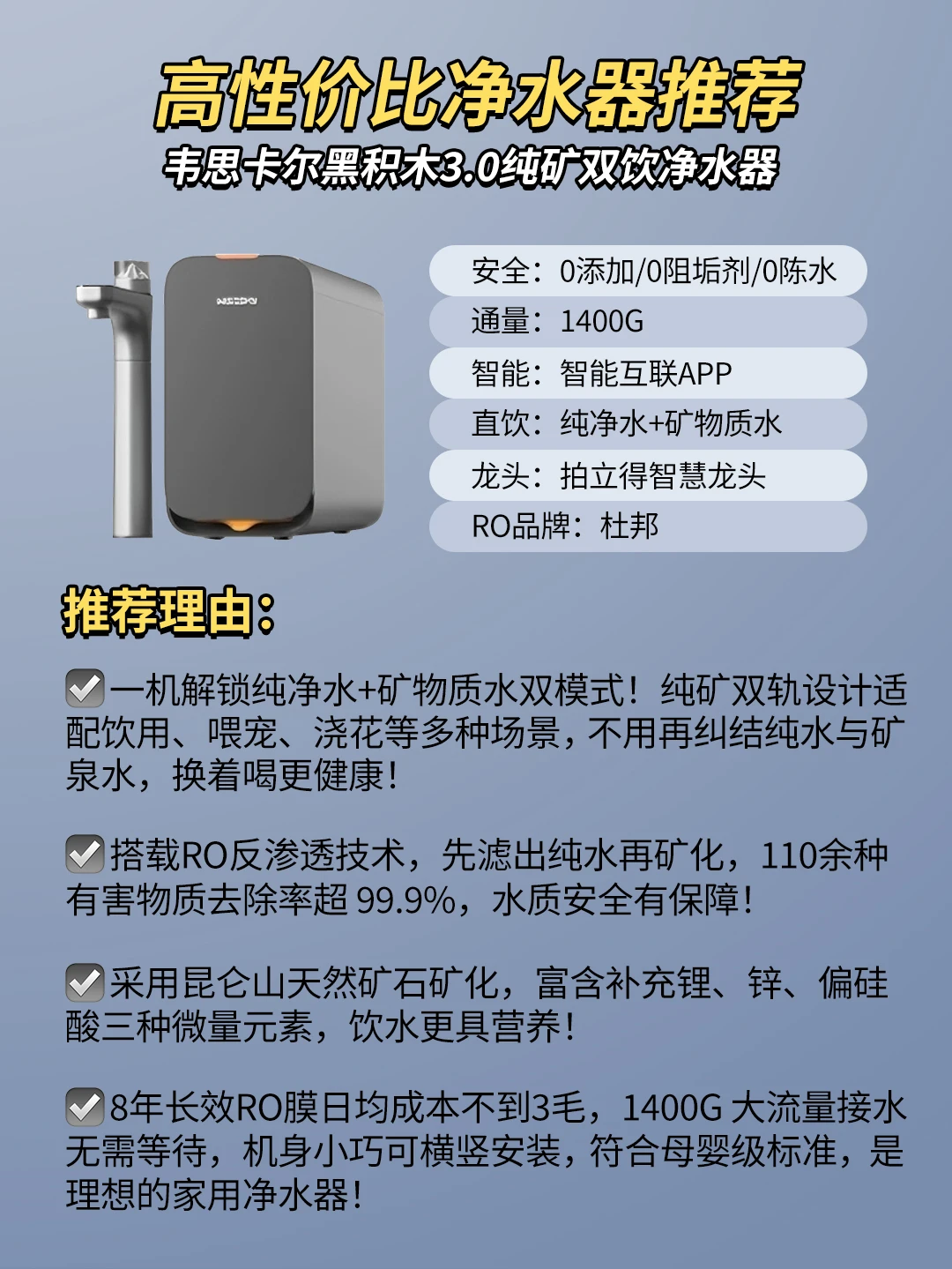 对自己和家人健康负责,选净水器真的不能马虎!尤其是对有孩子的家庭来说,既要水质干净,又想喝到有营养的水,做足功课挖到宝藏韦思卡尔黑积木3.0纯矿双饮净水器