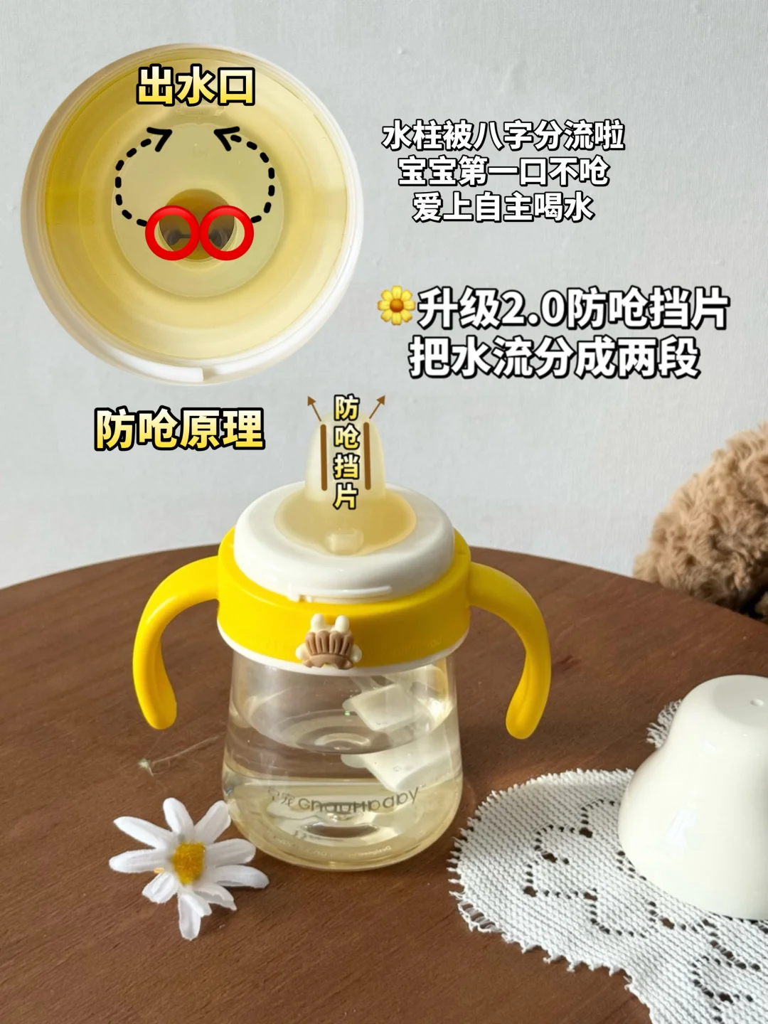 它这个鸭嘴带内置防呛挡片,出水是八字M型的小水串,不是直接滋出来滋到喉咙里的那种水柱。宝宝咬一下,水是慢慢滴出来的💦,流速比较稳,不太容易呛到。