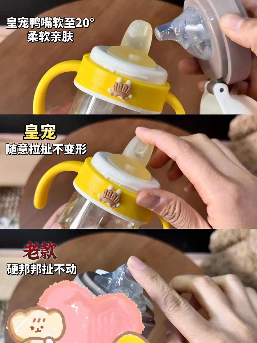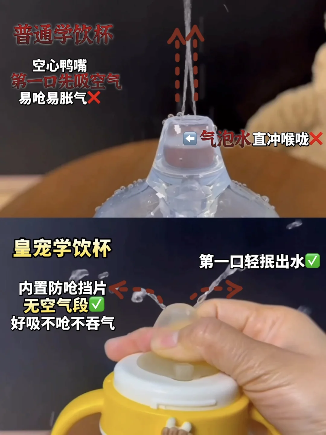 这点我比较在意。有些杯子鸭嘴是空心的加上捏着杯子辅助出水,有时候就很容易气混着水一起进入宝宝肚肚,宝宝涨涨的不舒服自然不爱喝。皇宠鸭嘴内部没有空气段,宝宝轻轻一抿就是水,喝着不费劲一口气干了半杯肚肚也舒舒服服的自然爱上自己喝水。