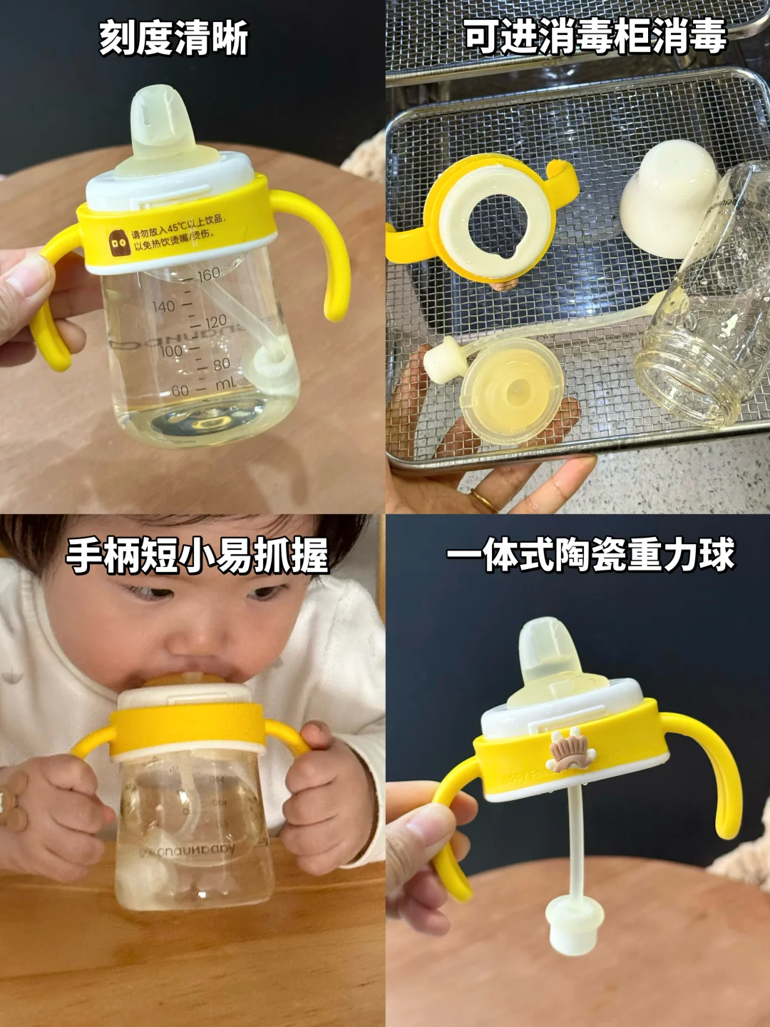 配件搭配比较灵活——可以配三种吸嘴(鸭嘴、吸管嘴、直饮嘴),两根吸管(重力球、直吸管),从4个月左右一直用到再大一点,不用频繁换杯子。