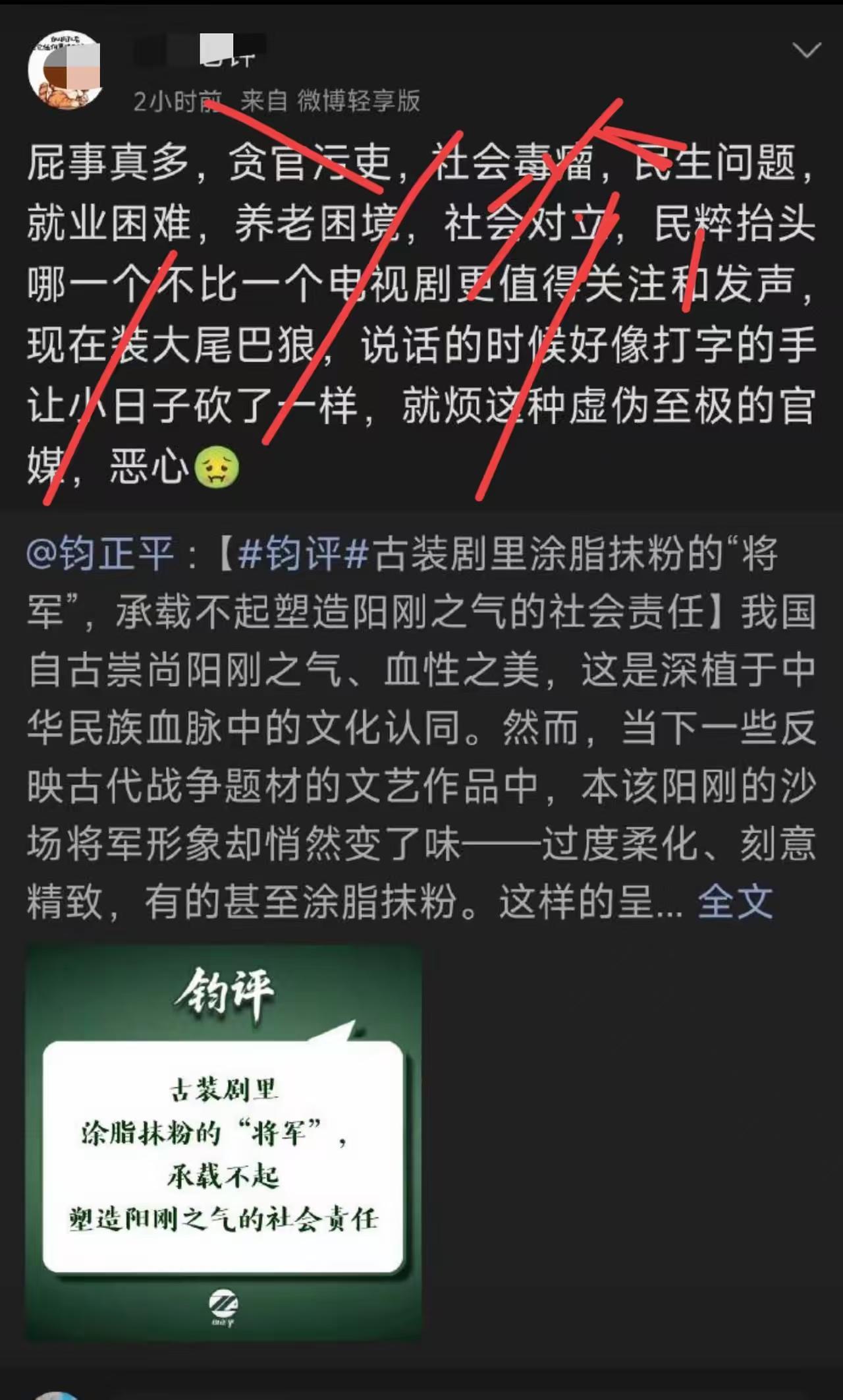 张凌赫粉丝冲钧正平官微。第一张截图我觉得说的没错啊,核心意思就是该操心的不操心,不该操心的瞎操心。 一部秀色可餐的下饭剧而己,没必要上刚上线,总觉得是主角太帅惹的祸。 电视里面将军让你操什么心?假如说现实中真的上来了这么一位将军,我猜他绝对又不敢说了。 就静静的看着他们作吧,哪天给人整怒了,再整顿整顿内娱,再封杀一批,这群作的就美了。 这是文化领域通过偶像对年轻一代一点点渗透,阴柔、娘化、去雄,不是下饭剧那么简单。 这帮粉丝不是要把粉底液将军放火上烤吗,不知道是真粉丝,还是水军。 不好说,我都已经被好几个粉丝怼了。 说古偶又不是正剧、嫉妒爱豆火了之类的话。