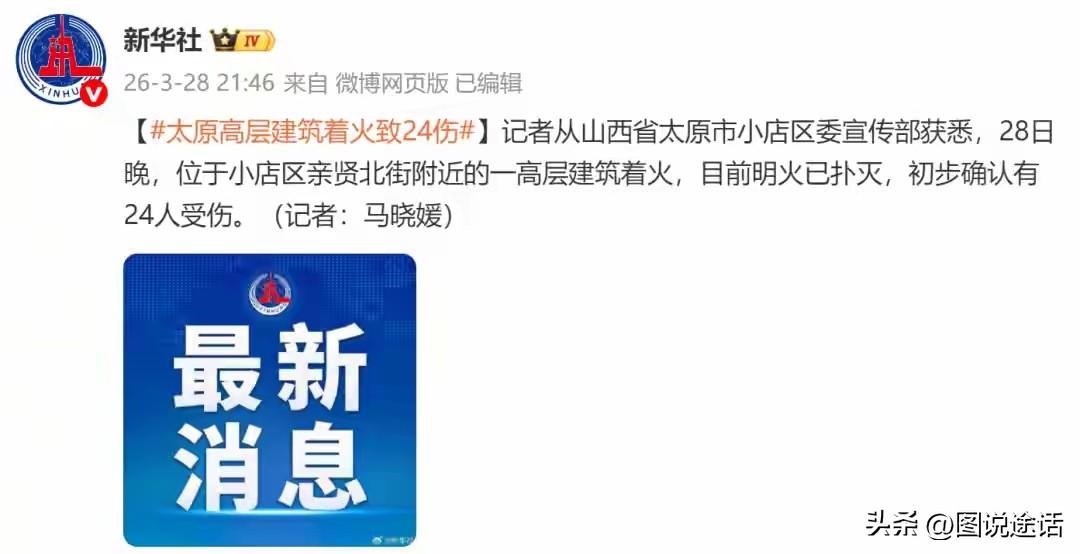 惊险一幕!高层建筑失火致24人受伤送医!事发山西太原。据媒体报道,3月28日晚,山西省太原市亲贤街一处高层建筑发生火灾,现场火势凶猛,大火沿建筑外立面迅速蔓延,并不断有燃烧的外墙材料落下。据悉,火灾发生地位于亲贤街核心商圈。目前现场明火已经扑灭。火灾造成24人受伤送医。火灾原因正在调查中。 太原亲贤街高层火灾致24人受伤,再次为高层安全敲响警钟。日常防火要严控电器、燃气风险,不占用消防通道、不在楼道堆杂物。火场逃生绝不坐电梯,低姿捂鼻沿楼梯疏散;若楼道浓烟密布,立即关门封缝、泼水降温,开窗呼救等待救援。社会热点 山西太原一高层建筑28日晚发生火灾 太原亲贤街火灾致24人受伤送医