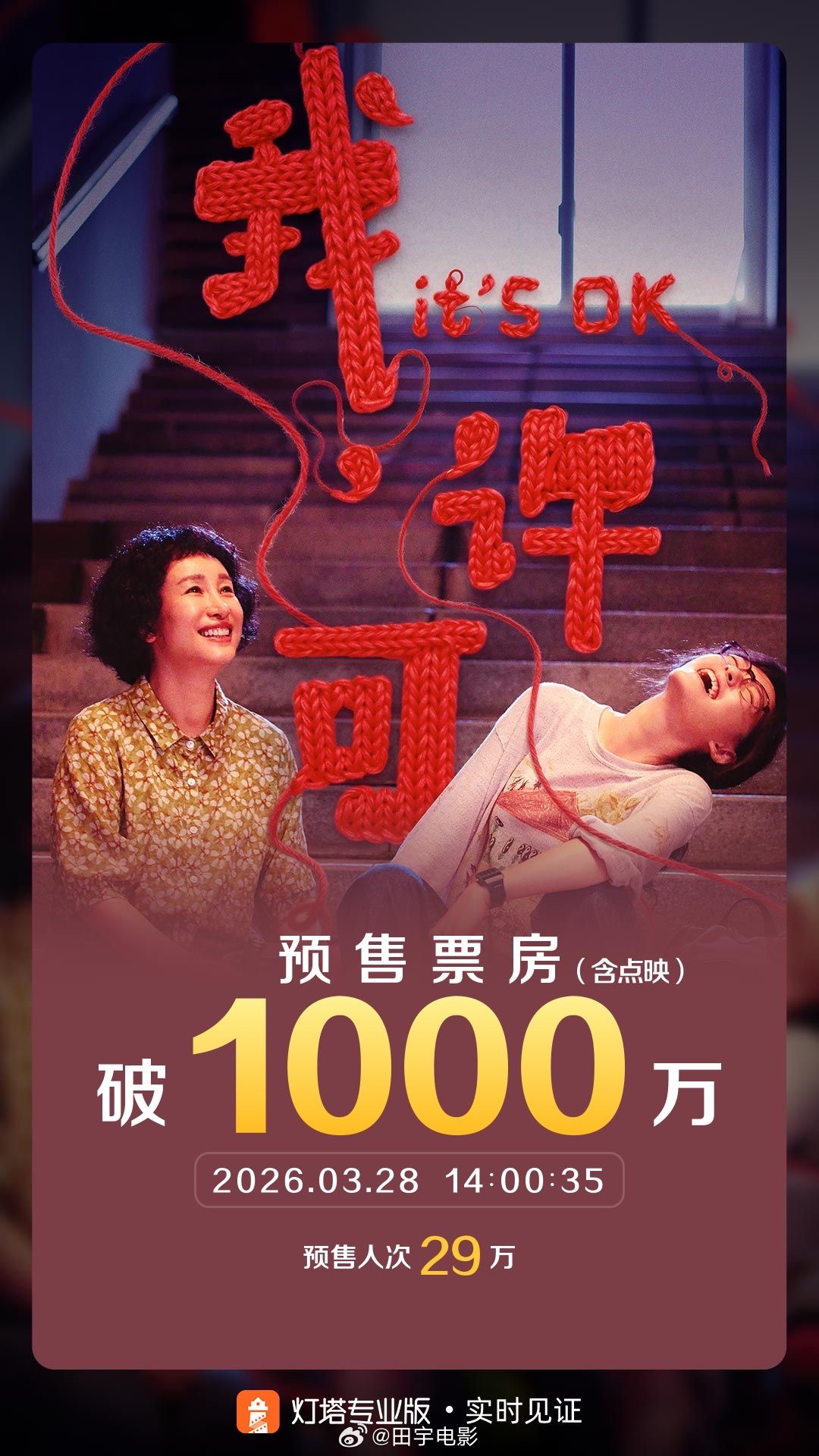 我许可预售票房破1000万《我,许可》👓距正式上映前6天,点映及预售票房破1000万,目前领跑清明档票房榜。小而美的片子,能出成绩真不错。恭喜🎉🥂杨茘钠导演,主演文淇田宇院线播报
