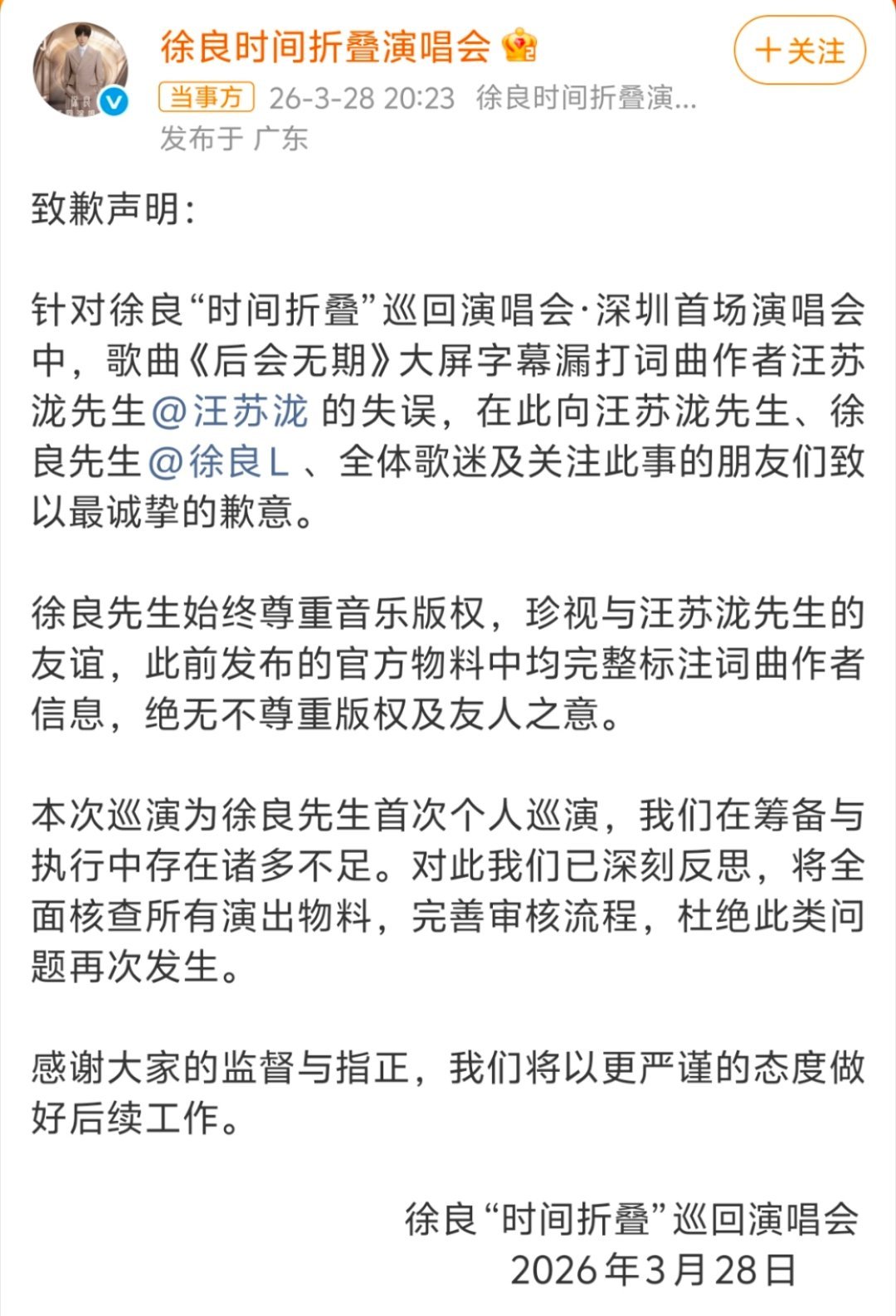 徐良方致歉声明3月27日徐良深圳演唱会,《后会无期》字幕漏标汪苏泷署名,而当晚汪苏泷新加坡场唱同一首歌时完整标注了两人名字。次日主办方发声明致歉,称是审核疏漏,承诺完善流程。徐良在第二场演出公开道歉,说下台后既生气又煎熬,第一时间联系汪苏泷,对方只回“嗨,没事”,没追究责任