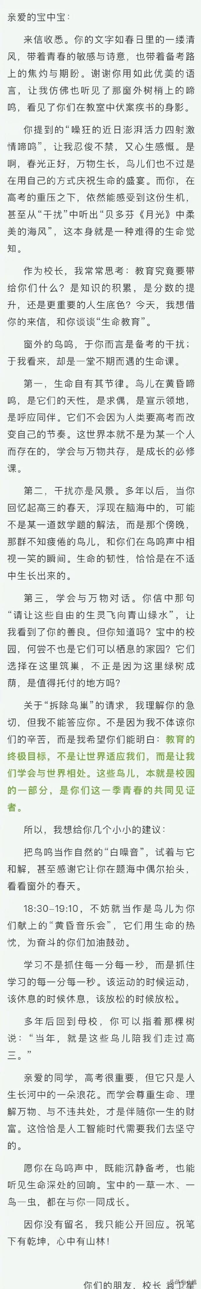 这个写信的学生后来也在个人账号上说话了。他说感谢校长的教导,让他对生命和自然有了新的思考。他还说,自己认同校长的用心,会安心备考。