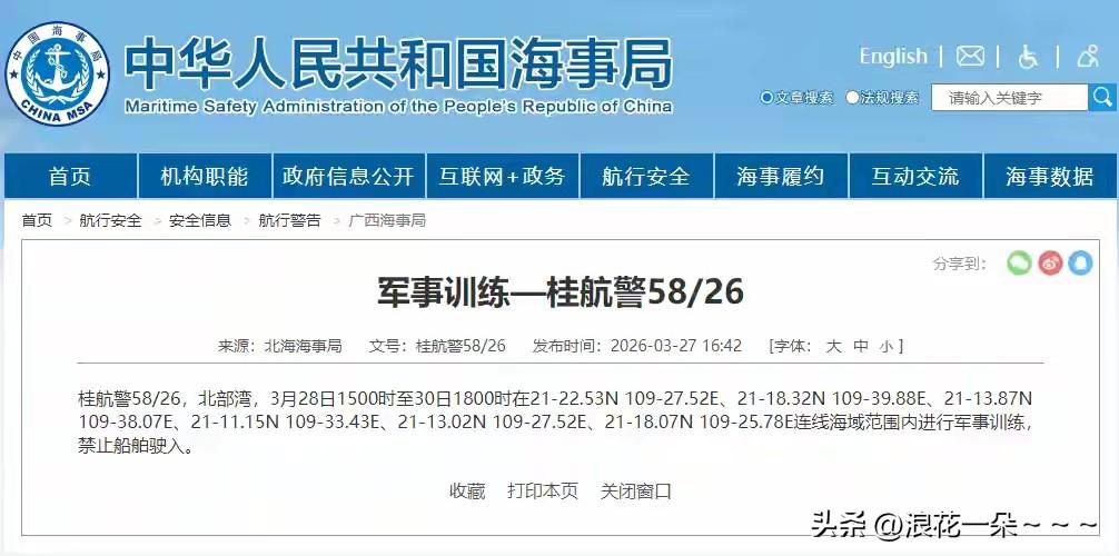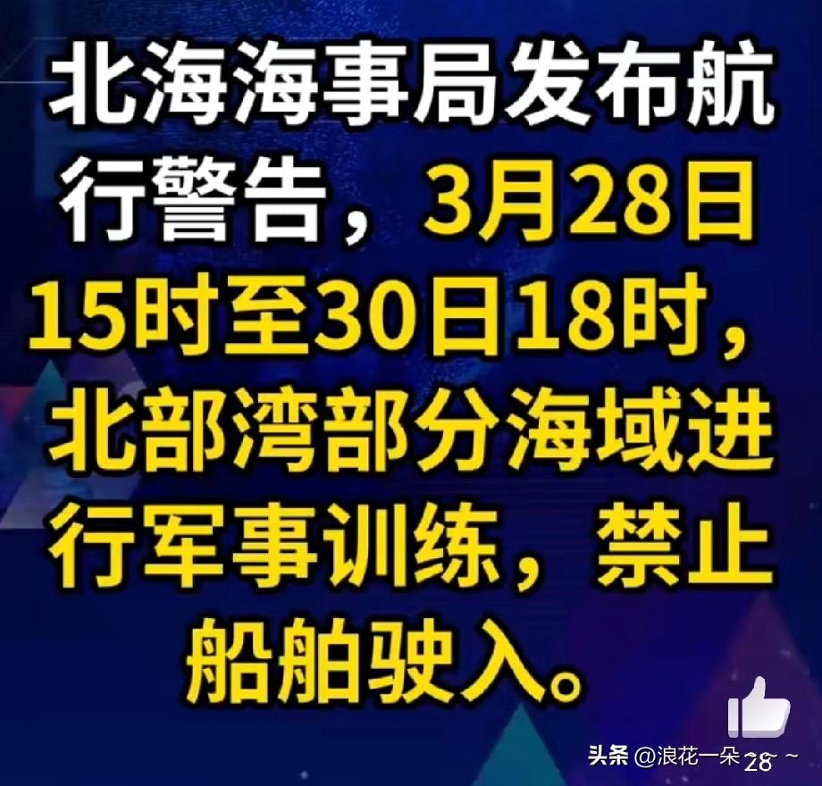 快讯!快讯! 就在刚刚,一下子很罕见的看到了两个航行警告! 一个是北海海事局发布航行警告。 一个是大连海事局发布航行警告。 他们有一个共同的特点,就是在划定的范围之内进行军事训练(执行军事任务)禁止船舶驶入。 当然了,划定的范围由于太专业了,我也看不懂。 对于禁止驶入的时间,大连海事局是3月29日16时到4月5日16时!北海海事局是3月28日15:00到3月30日16时! 信息来源:北斗融媒,央视新闻
