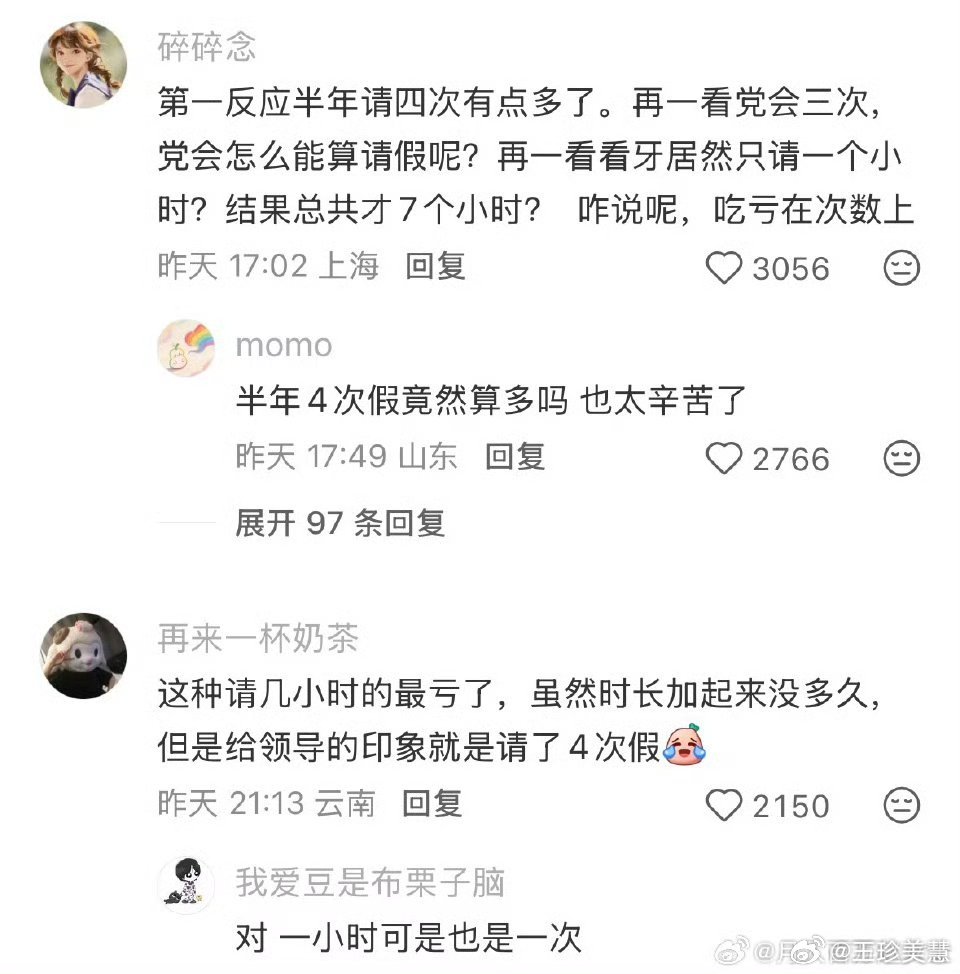 建议一次请假请一天不容易啊这一看就是公务员请假就是按小时算