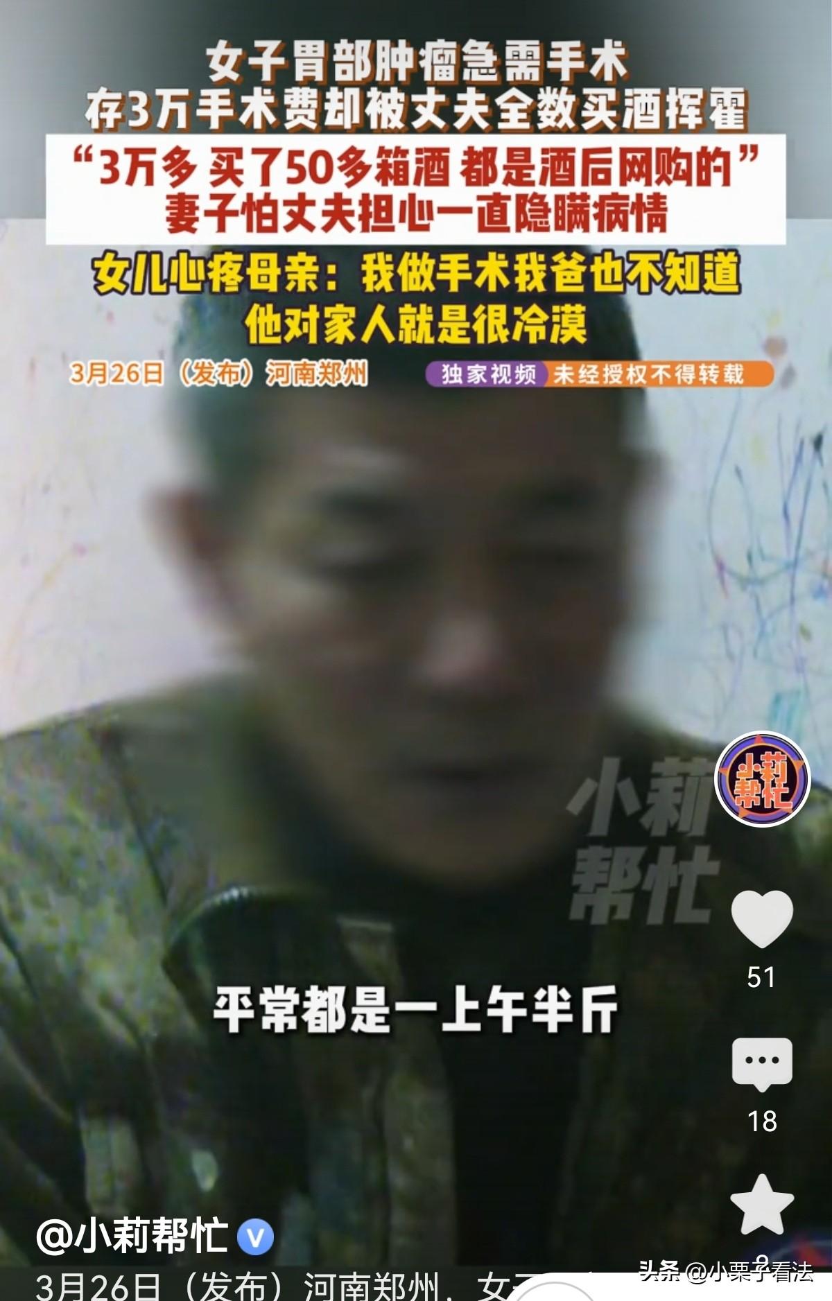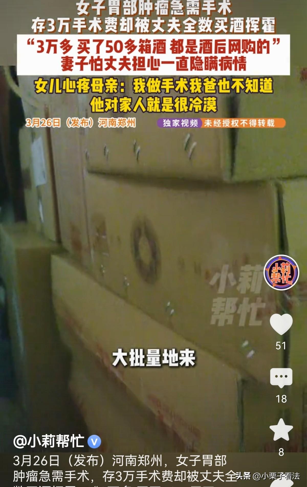 河南郑州,女子患重病,怕丈夫担心一直没说。她凑够3万块钱,想按预约时间去做手术。谁知,丈夫竟把3万块钱在网上全买了白酒。23箱送到家,女子才发现,还有50箱在运输途中。丈夫说:她有病我也不知道!我早上半斤酒,晚上半斤!买酒时喝懵了!女子崩溃:手术时间还有2天,你这是要我的命?女儿:我爸对家人很冷漠,他只考虑自己! 女子最近遭遇的事,让她彻底寒透了心,逢人就说自己的丈夫根本不是来过日子的,是来催命的。 女子早前总觉得胃里不舒服,吃点东西就胀得难受,有时候还疼得直不起腰,拖了一阵子实在扛不住,才去医院做检查。 这一查,结果如同晴天霹雳,她的胃里长了肿瘤,还带着息肉,医生说得很清楚,必须尽快安排手术,拖着不做就是在等死。 得知病情的那一刻,女子当场就哭了,她不是怕死,是放心不下家里的女儿,孩子还小,她要是没了,孩子以后可怎么办? 好在医生安慰她,手术不算特别复杂,只要及时做,术后好好休养,恢复的希望很大,还跟她约好了手术时间,让她先回家准备好手术费。 女子心里又慌又急,但也总算有了盼头。 她平时省吃俭用,一分钱掰成两半花,攒了两万多块钱,她又东拼西凑,终于凑够了3万块钱,便把这笔治病的救命钱藏在家里,等到时间去医院手术用。 谁知,在与医生预约手术还有2天时,突然发现屋里堆满了未拆箱的白酒,竟有23箱,密密麻麻堆满了屋子。 女子心里咯噔一下,一股不祥的预感涌上来,她顾不上别的,疯了一样跑去藏钱的地方翻找,可翻了半天,那3万块救命钱连影子都没见着。 她又急又怕,浑身都在发抖,转头就质问整天在家的丈夫,钱到底去哪了。 丈夫却一脸无所谓,还装糊涂,支支吾吾地说自己喝多了记不清,只说看手机直播卖酒,脑子一热,手一点一点的,就把钱全花了,一口气买了53箱白酒,还有30箱在运输途中。 女子如五雷轰顶,急得号啕大哭,痛骂丈夫不是人!她嘶吼着说自己胃里长了肿瘤和息肉,跟医生约好了手术,这3万是救命钱,不做手术就活不成了,质问他是不是压根不想让自己活。 可丈夫却一脸冷漠,推说自己根本不知她得了这么重的病,没人跟他说要做手术,一副事不关己的样子。 女子说得知自己生病他也不管,干脆就没告诉他,省得他操心操不到点上还添乱。 女子让他赶紧把酒退了,把钱要回来做手术,丈夫却连理都不理,说自己是喝醉了买的,根本不知在哪退,找不到地址。 一旁的女儿实在看不下去,站出来指责父亲太自私,妈妈生病不管,就连自己之前做手术,父亲也一概不知,心里从来只有他自己。 对女儿的指责,他不仅不愧疚,还满是理由:我上午半斤酒,下午半斤酒,不买喝什么?他丝毫不觉得自己有什么错,反倒怪妻子以前给他买酒喝,喝出酒瘾了! 女儿气坏了:你怨我妈干啥?你就是对家人冷漠,只考虑自己! 丈夫平日里就好吃懒做,根本不想出去工作,以前做废品生意赔了,就天天借酒浇愁,一天醉两倒家里的事一概不管。 他还总找借口,说出去打工一天才挣一百块,太少了看不上,就在家喝酒混日子,靠着妻子勉强维持生活。 在女子的痛哭和数落下,丈夫终于软了下来,承认自己做事不对,向妻子道歉,说会慢慢改!可能他也怕妻子治不好病,他以后没依靠了吧! 还有2天就到手术时间了,钱没了,酒退不掉,这可咋办啊? 走投无路,女子找媒体帮忙,希望找到退酒渠道! 记者看着堆满屋子的白酒,再看看泣不成声的女子,也觉得十分气愤,赶忙帮忙联系卖酒的商家,反复沟通之后,对方终于同意退货。 让女子把已收到的酒寄回厂家,收到货后就把货款退回来,那些没到的白酒,也直接取消订单。 女子这才松了一口气,可心里的委屈和寒心却久久散不去。 《民法典》第1062条:夫妻对共同财产,有平等的处理权 。 3万元虽由妻子积攒,但婚内无特别约定则属夫妻共同财产,丈夫未征求妻子意见擅自动用这笔钱去买酒。 《民法典》第153条第2款:违背公序良俗的民事法律行为无效。 丈夫在妻子病重、手术在即之际,挪用救命钱买酒,严重违背家庭伦理与公序良俗。 妻子可主张该购买白酒的合同行为无效,或撤销该处分行为,追回款项。 有人说,丈夫心里明镜的吧,就是借口,就是怕妻子把钱全治病了,没钱买酒喝! 有人说,这哪是男人干的事?太自私了!哪有一点担当和责任呀! 还有人说,酒蒙子不配有家庭,他就这德行了,改不了了! 对此您怎么看?