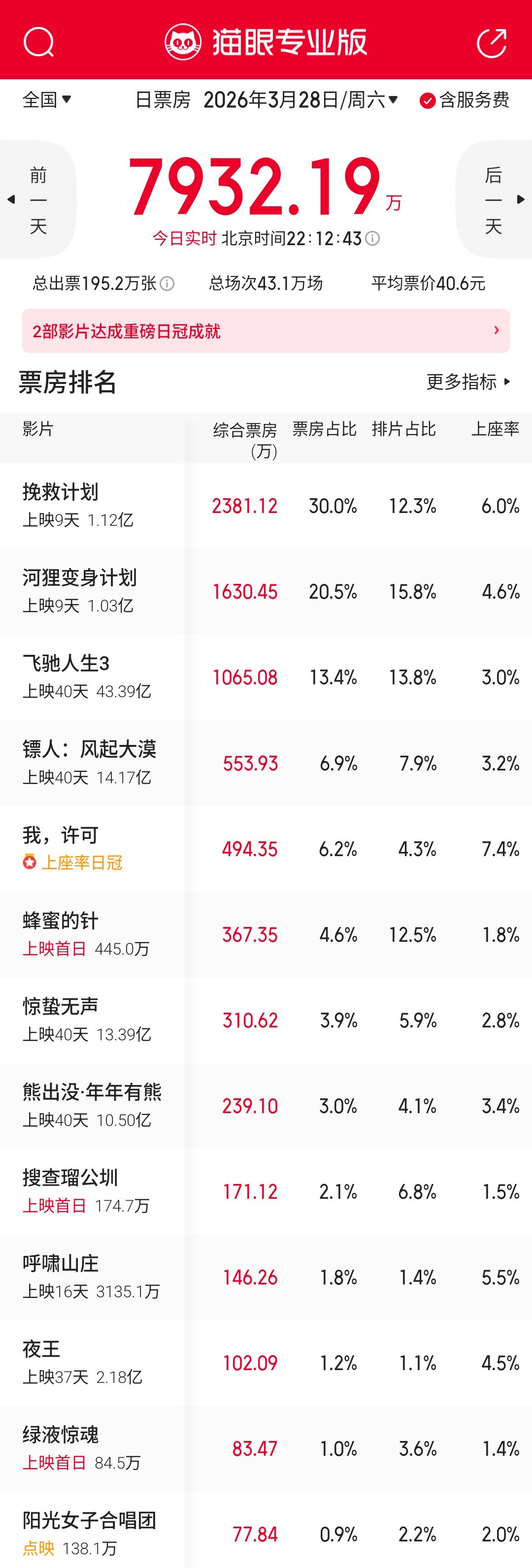 《挽救计划》真的有点复刻《F1》的架势,公映次周末票房比首周末还高,预测票房涨到了1.87亿。《河狸变身计划》后劲也不错,预测票房同样在涨。这两部最开始预测票房都是1亿左右,后期走势都更好,也是春节档后仅有的两部票房破亿电影。《我,许可》点映上座率尤为突出!