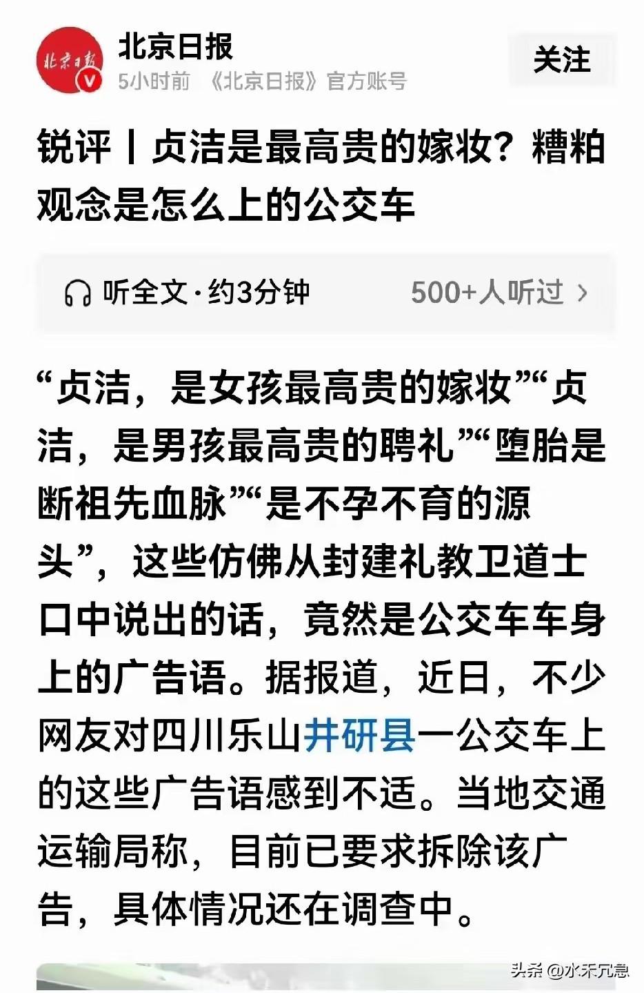 项立刚硬刚官媒北京日报,我为他点赞!北京日报这篇批判贞洁是封建糟粕的文章,相信正常人都不会苟同!。 起因是四川乐山的一辆公交车上,贴着一些标语,上面写着“贞洁是女孩最高贵的嫁妆,贞洁是男孩最高贵的聘礼”。 没想到北京日报竟然公开发文批判,称这句标语是封建糟粕,这一举动引发不小的争议,目前北京日报已经删除了这篇文章。 我想不明白了,劝男女都洁身自好,预防传染病,这怎么能是封建糟粕?难道这个社会男盗女娼,滥交,才是进步吗?哪怕是西方主流的价值观,也不会认为保持贞洁是封建糟粕。 作为国家主流媒体,不知道北京日报为什么要这样说?这种媒体的价值观真是令人汗颜。 项立刚说的对,只有婚前喜欢乱搞,婚后也在偷情的人,才会痛恨贞洁。正常人都会洁身自爱,因为这是家庭幸福、身体健康的保证。