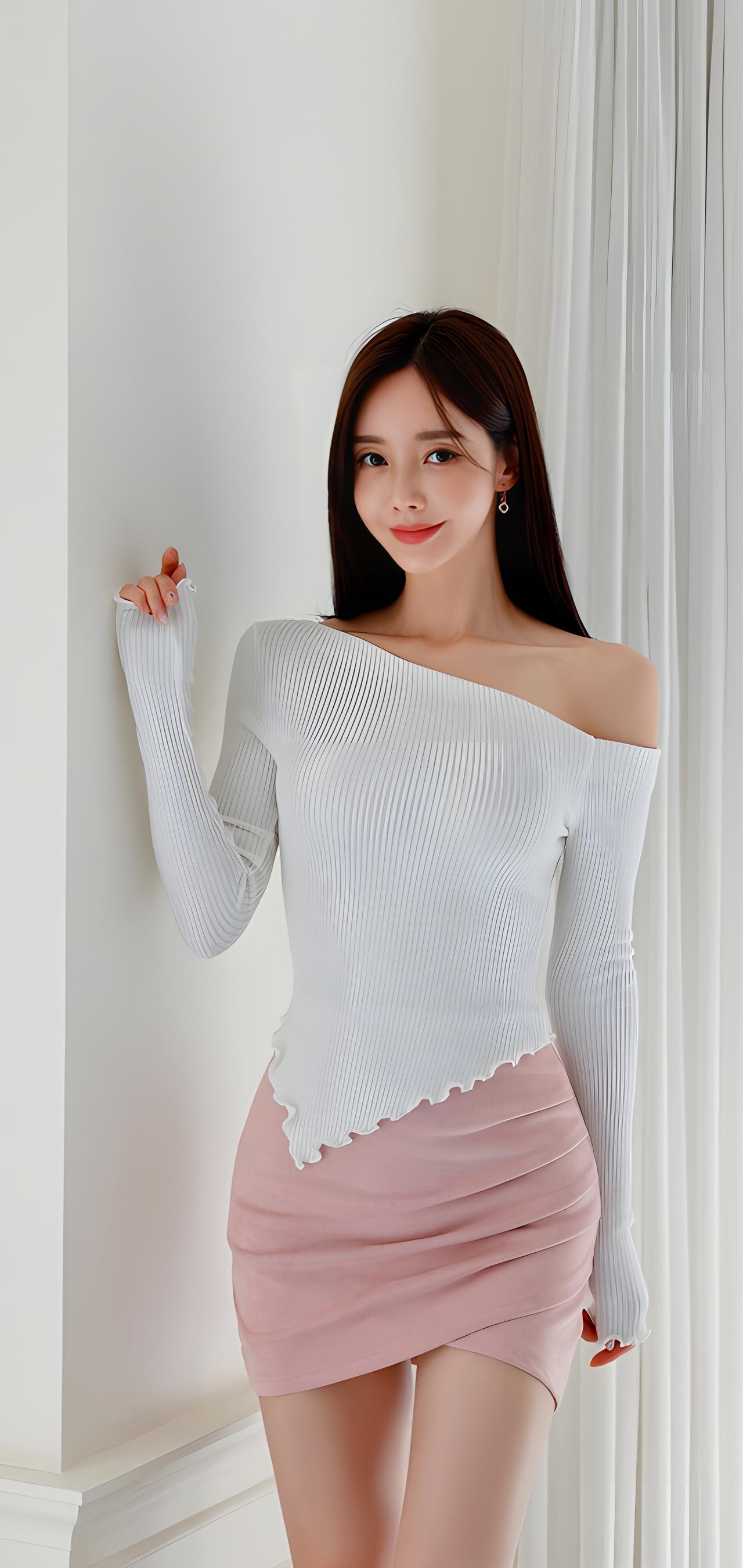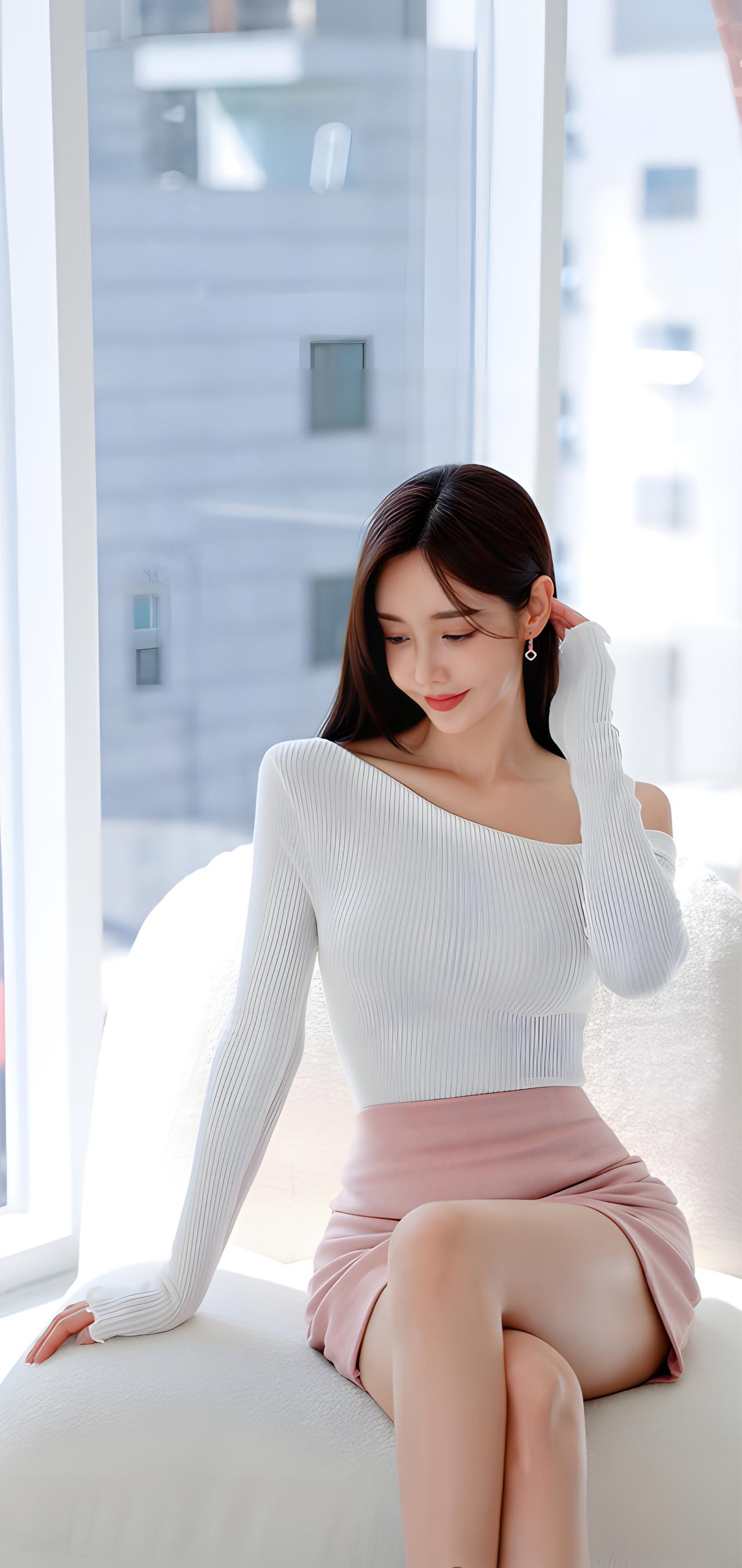 优雅白裙少女,粉色短裙搭配,清新甜美,阳光洒进室内,浪漫氛围满满!