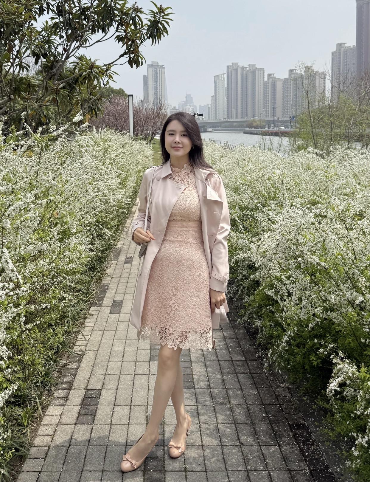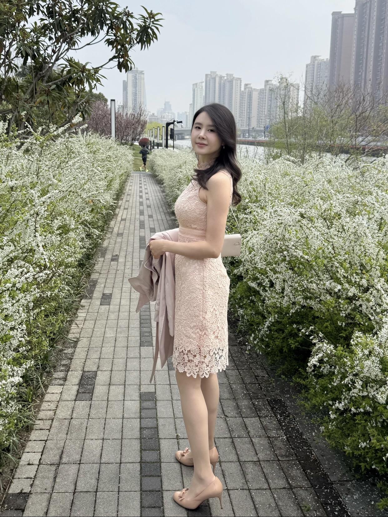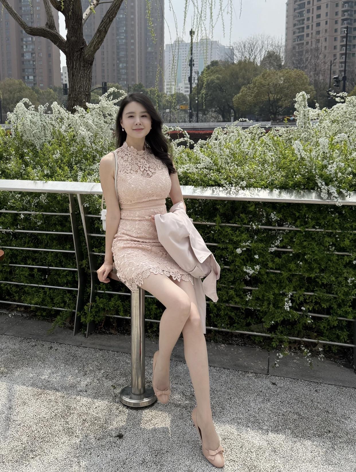 优雅都市女孩,粉色蕾丝连衣裙,都市绿意中享受宁静时光。