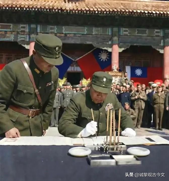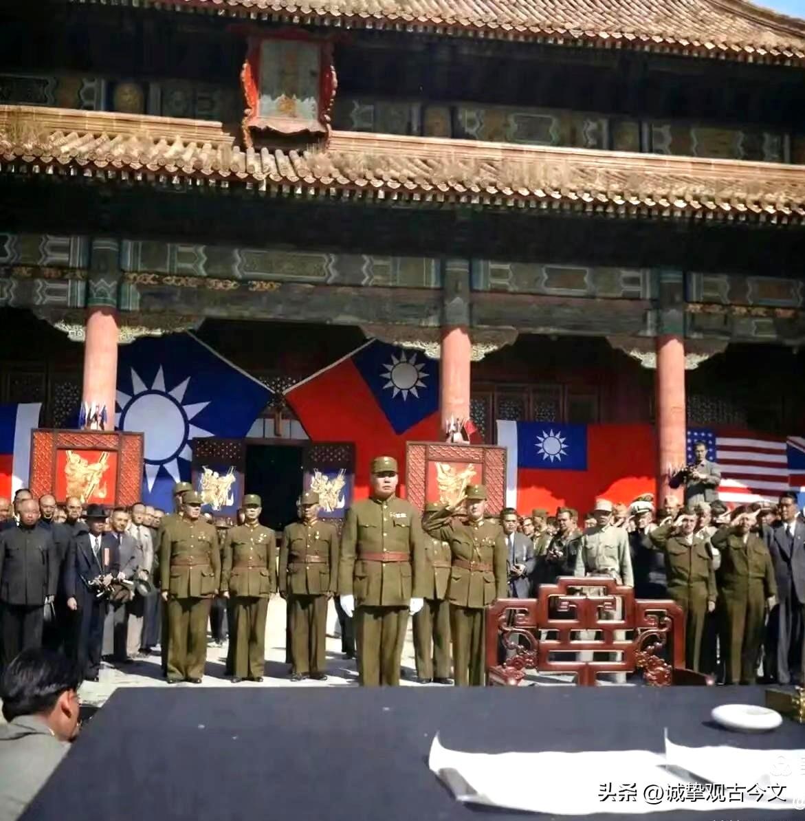 1945年抗战胜利,太和殿受降【上色老照片】 1945年太和殿受降,孙连仲将军强硬拒绝日军保留军刀企图,20万同胞见证民族雪耻。 1945年10月10日,北平故宫太和殿广场,20万民众齐聚,见证中国抗战史上最扬眉吐气的时刻——华北战区日军正式投降。 这场受降的核心争议,正是孙连仲将军严词拒绝日军保留佩刀的无理要求,以铁血立场捍卫民族尊严。 当时,华北日军受降原定在中南海怀仁堂举行。日军竟妄图保留佩刀,这一要求被中方当场驳回,受降地点也改至太和殿,让天下人共睹侵略者低头。 作为第十一战区司令长官、受降主官,孙连仲将军全程坐镇,明确下令:日军投降代表必须当众缴械献刀。 日军高层根本博、高桥坦等人托人说情,试图以“保留武士道体面”为由拒交佩刀,均被孙连仲断然拒绝——投降就是投降,没有体面可讲,军刀必须悉数上缴。 仪式上,根本博率20余名日军军官垂首入场,在万众注视下,双手捧刀、躬身献缴,将21把沾满国人鲜血的军刀逐一放在受降桌上。 孙连仲将军肃立受降台,目光如炬,以胜利者的姿态接受投降,全程不发一言,尽显民族骨气。 短短25分钟的仪式,是十四年抗战的终章,是太和殿百年荣光的续写。孙连仲将军的强硬态度,击碎了日军最后的傲慢,让侵略者明白:在中国土地上耀武扬威的时代,彻底终结。 这段历史从不是模糊的旧照,而是刻在民族骨血里的记忆。拒绝妥协、捍卫尊严,是孙连仲将军的选择,更是全体中国人的底气。铭记这一刻,勿忘国耻,吾辈自强!