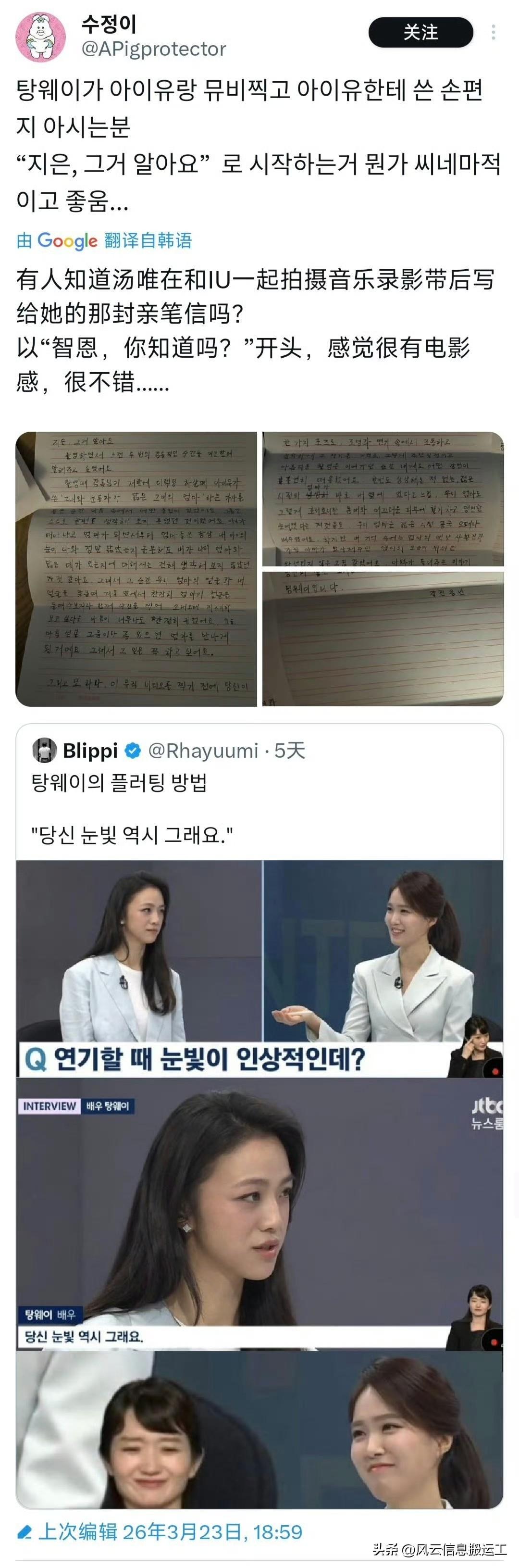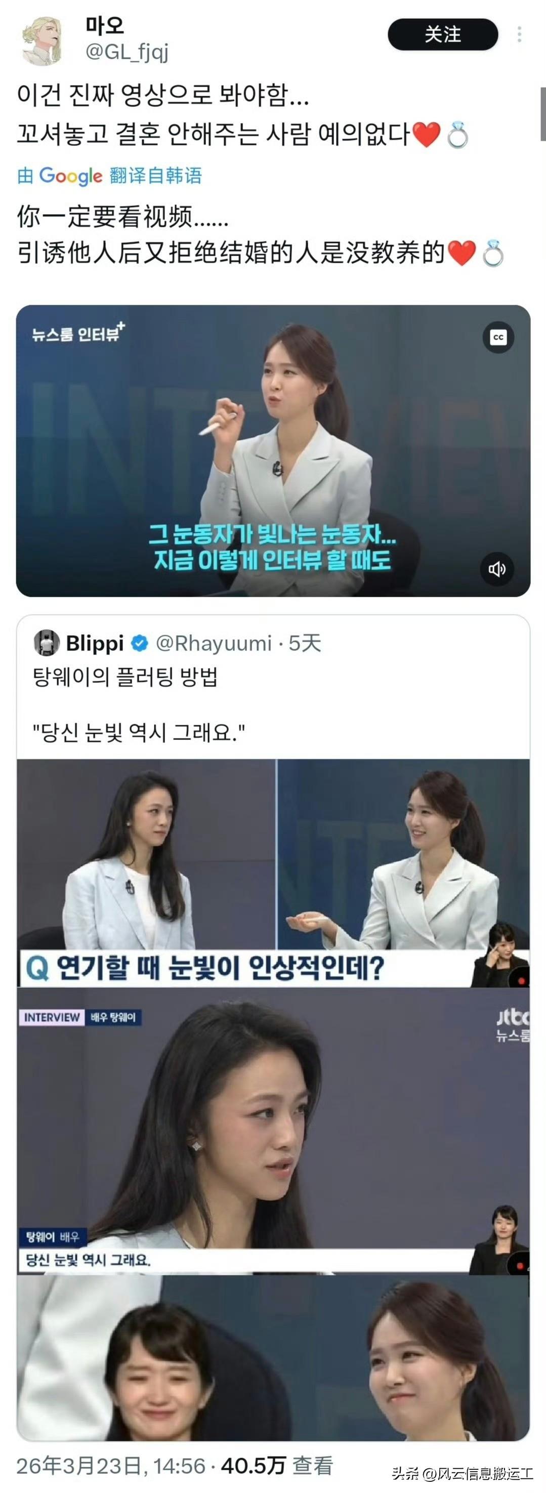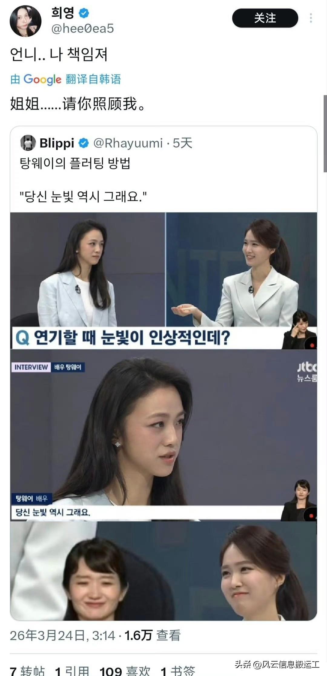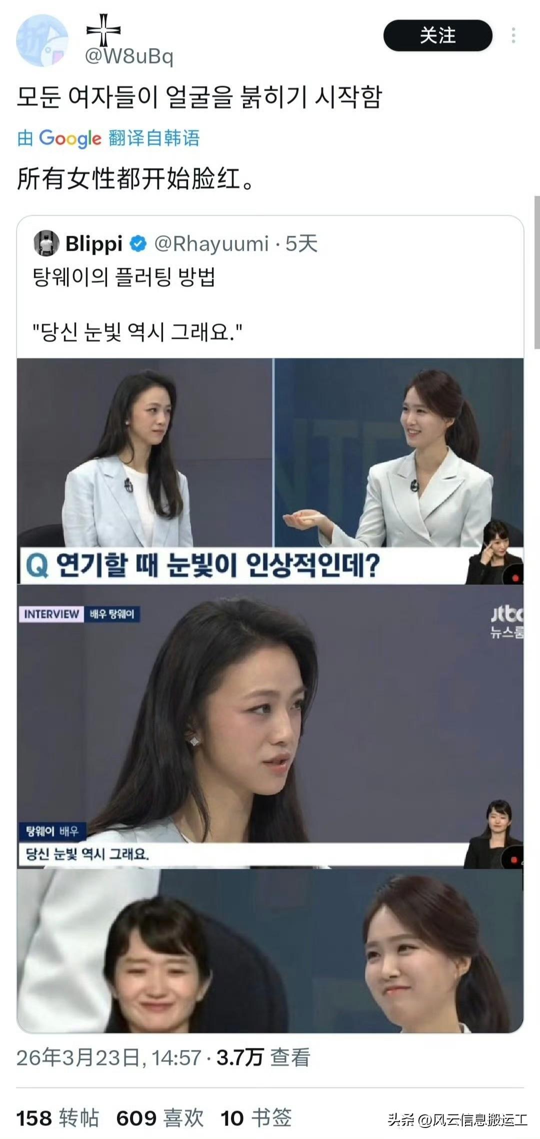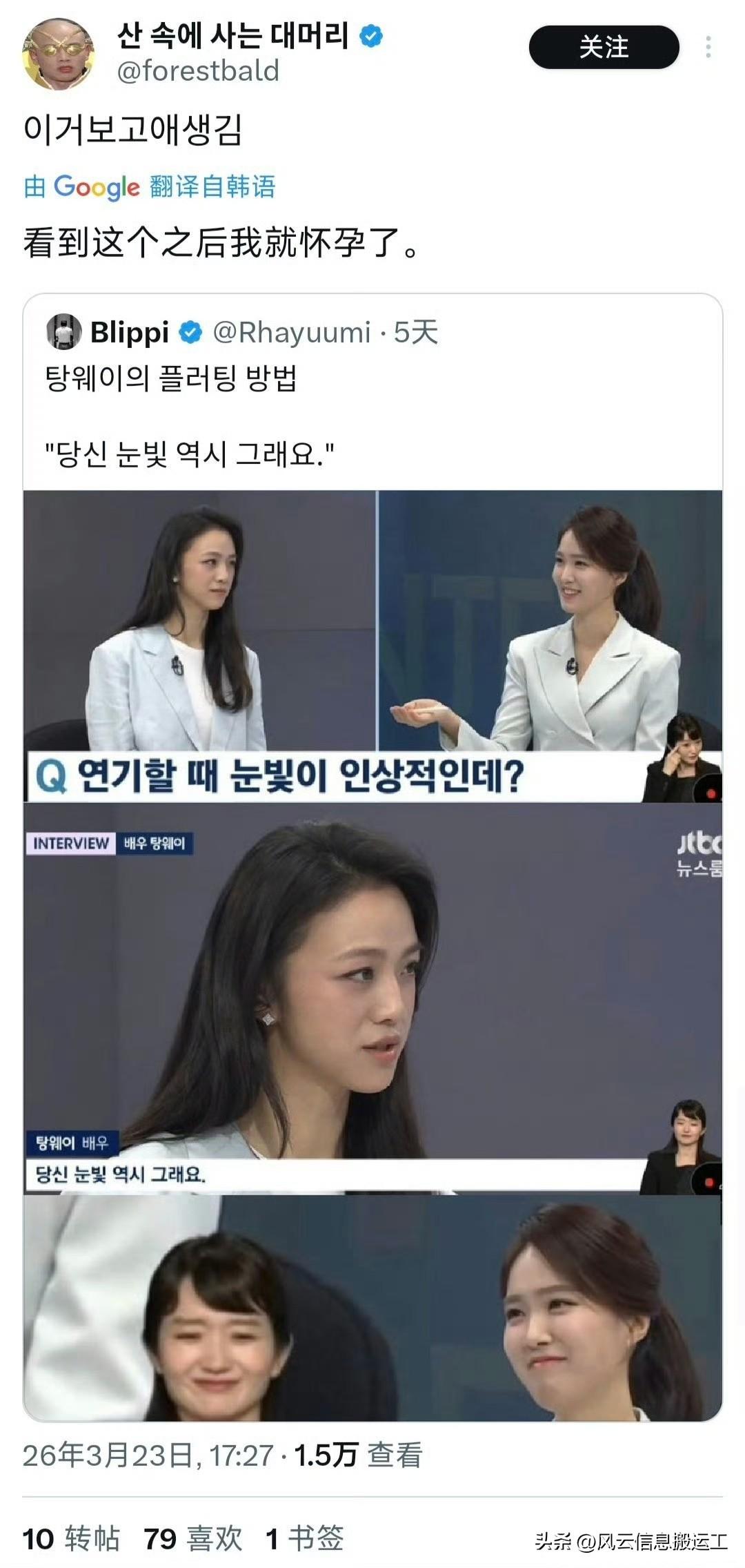汤唯在接受韩国电视台采访时,当主持人夸赞她眼神很厉害,眼睛闪闪发光,一旦对视就无法移开眼睛时,汤唯回答“你的也是”引起推特上韩国网友疯狂心动