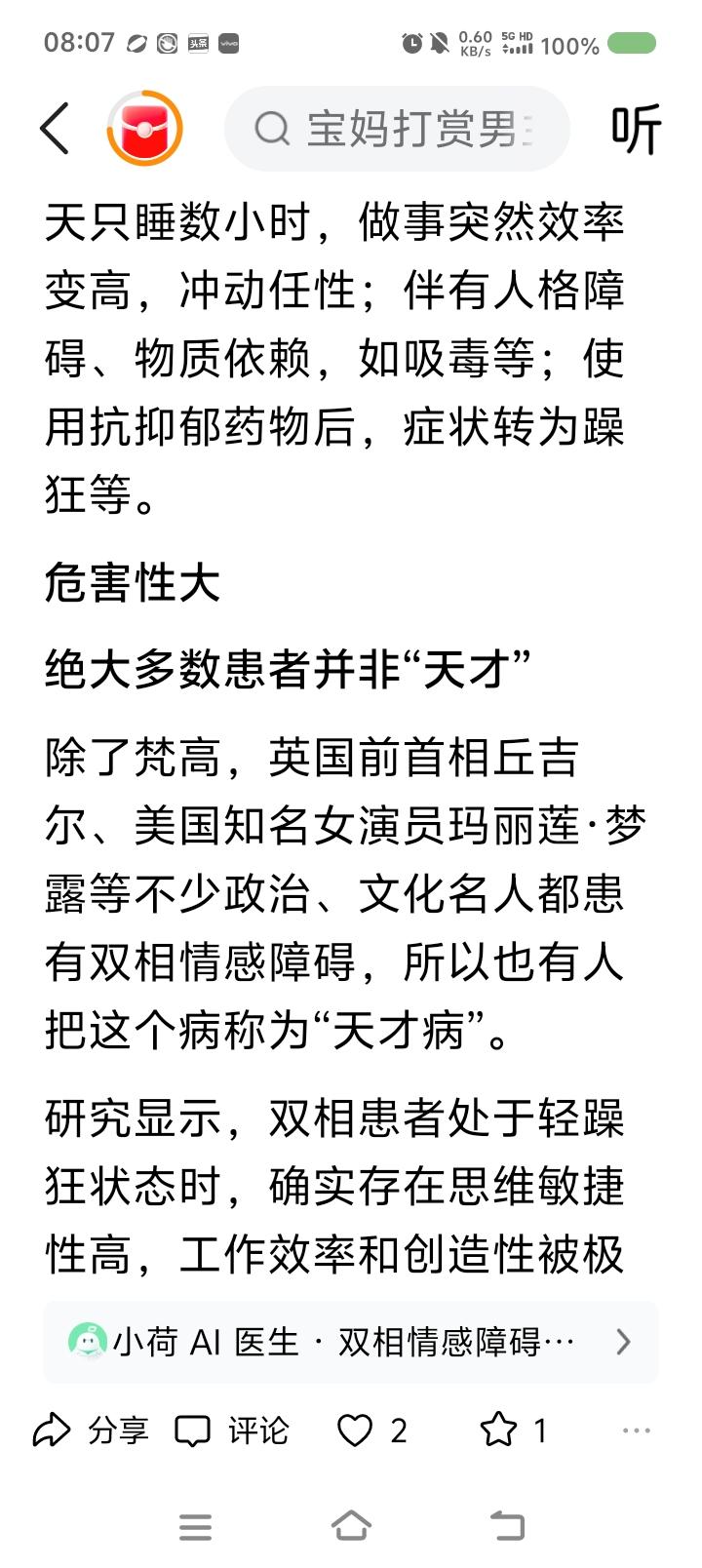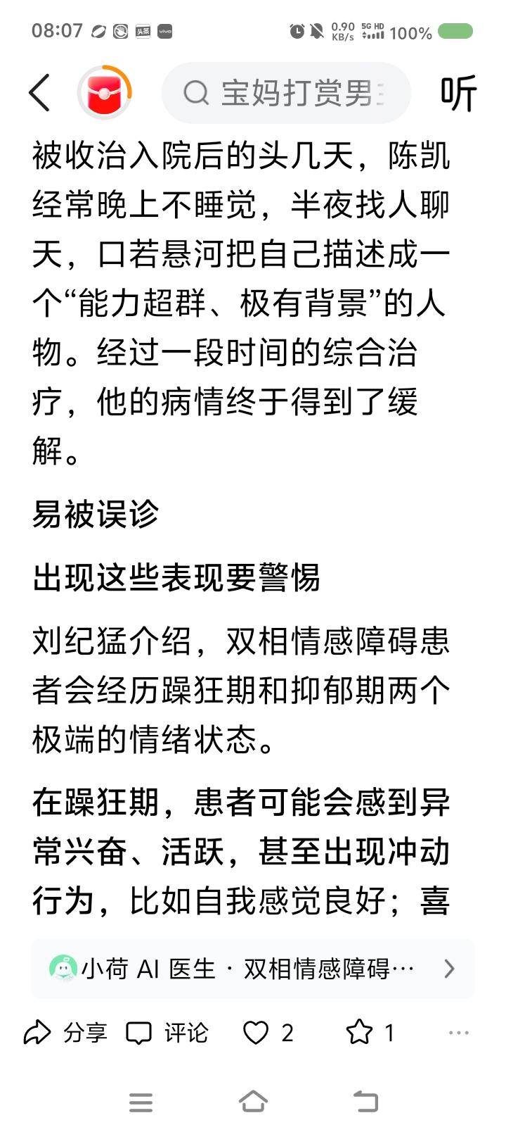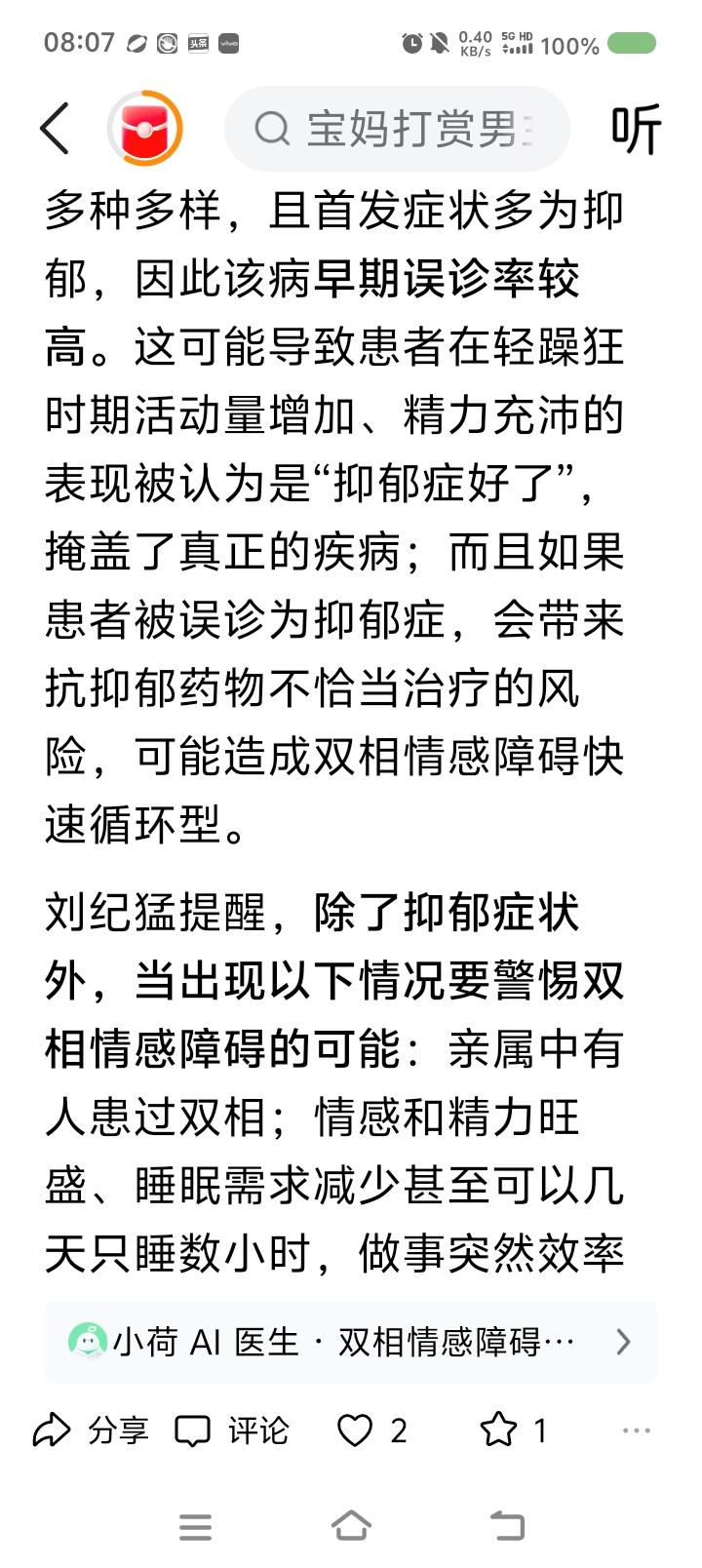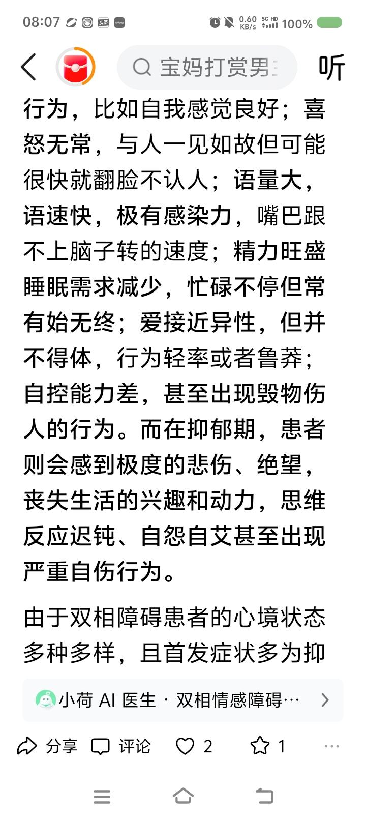 世界双相情感障碍日,来了—— 据报道,一男子突然躁狂,打赏主播,又疯狂网贷、打赏,已挥霍几十万。医生判断这叫双相情感障碍。一种精神疾病。典型表现是:有躁狂期、抑郁期。躁狂期里,患者爱接触异性,但并不得体。抑郁期里,患者病情严重时可能会自残。 此病易误诊为抑郁症。 3月30日为世界双相情感障碍日。 点评: 不适请去正规医院咨询,不可网上轻信他人判断。 专业治疗,家人陪伴,自己努力,任何疾病可缓解、治愈。 愿世界没有疾病,愿世界本身为天堂,愿健康伴随每个人。
