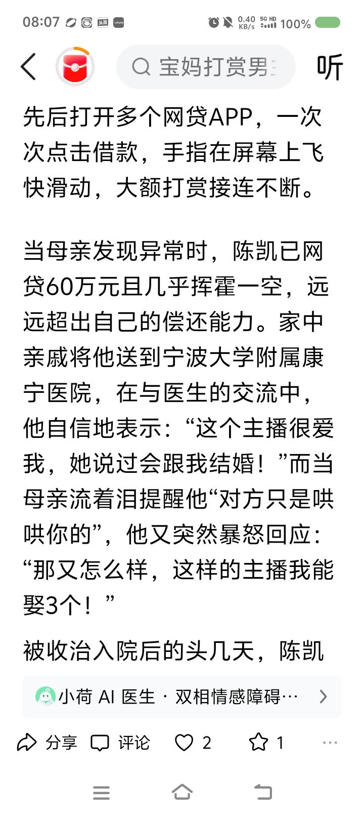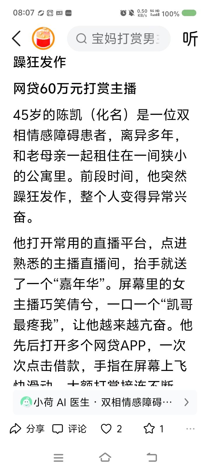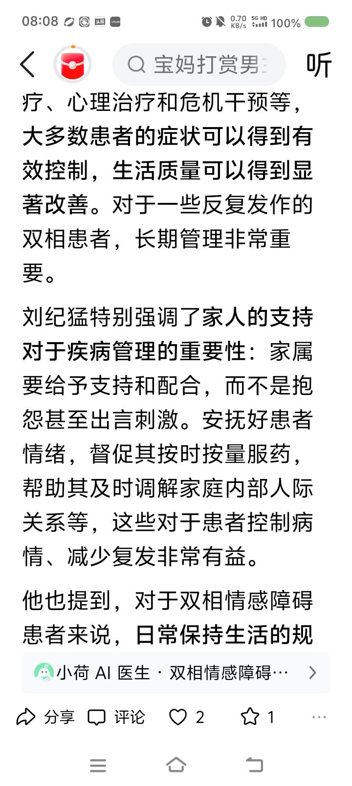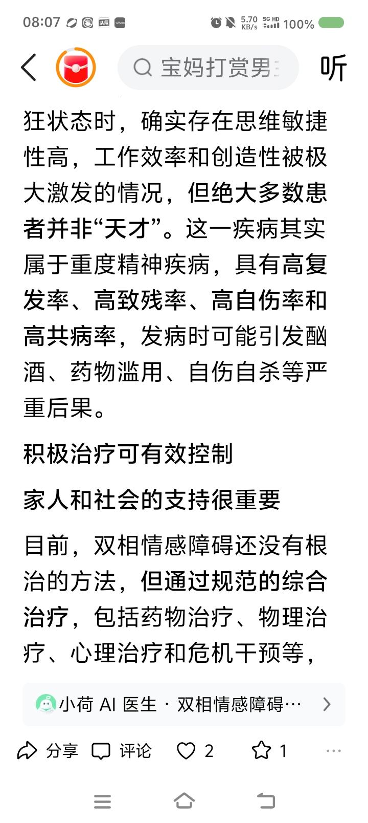 世界双相情感障碍日,来了—— 据报道,一男子突然躁狂,打赏主播,又疯狂网贷、打赏,已挥霍几十万。医生判断这叫双相情感障碍。一种精神疾病。典型表现是:有躁狂期、抑郁期。躁狂期里,患者爱接触异性,但并不得体。抑郁期里,患者病情严重时可能会自残。 此病易误诊为抑郁症。 3月30日为世界双相情感障碍日。 点评: 不适请去正规医院咨询,不可网上轻信他人判断。 专业治疗,家人陪伴,自己努力,任何疾病可缓解、治愈。 愿世界没有疾病,愿世界本身为天堂,愿健康伴随每个人。
