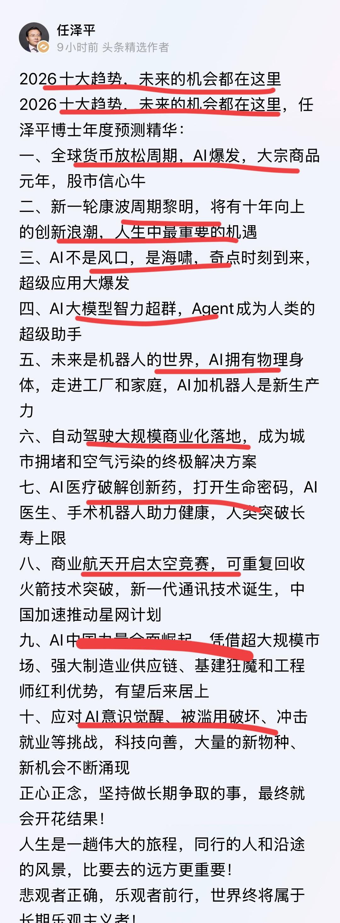 任泽平关于2026年的十大预测!! 太猛了,任博士,一上来又是十大预测,十大趋势。 赶紧看看,没准你还能抓住一个趋势; 实现你的人生巅峰呢!! 任博士被禁言一年,复出之后非常活跃; 每天都在预言未来,忙得不亦乐乎。 任博士最为恒大前首席经济学家,年薪曾高达1500万。 被誉为是中国最贵的经济学家。 恒大许总没听他的多次建议,负债2.4万亿,导致破产,太遗憾了。 我看了一下任博士关于2026年的十大预测。 有一个强烈的感受,就是AI彻底来了; 你今年如果不AI,就要被AI取代了。 十大趋势和预测,全部是AI!! 你有何看法,你能抓住这波AI浪潮吗,实现财富自由么?