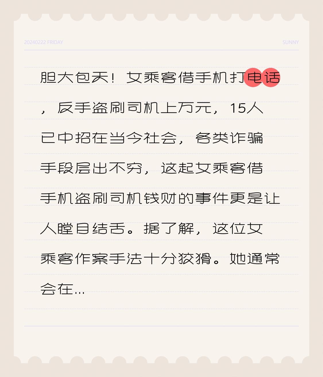 胆大包天!女乘客借手机打电话,反手盗刷司机上万元,15人已中招在当今社会,各类诈骗手段层出不穷,这起女乘客借手机盗刷司机钱财的事件更是让人瞠目结舌。 据了解,这位女乘客作案手法十分狡猾。她通常会在乘坐出租车或者网约车时,以各种理由向司机借手机打电话,比如称自己手机没电了,家里有急事需要联系等。善良的司机们往往出于好心就把手机借给了她。而她拿到手机后,会趁司机不注意,迅速打开手机支付软件,通过各种方式获取支付密码,然后盗刷钱财。 目前已有15位司机不幸中招。这些司机里有开了多年出租车的老司机,也有刚入行不久的新手。他们辛辛苦苦跑车挣钱,却遭遇了这样的飞来横祸。有的司机一个月的收入就这么没了,这让他们的生活陷入了困境。 警方接到报案后,高度重视这起系列案件。他们调取了大量的监控视频,对案发地点周边的情况进行了细致的排查。经过不懈努力,终于锁定了这名女乘客的行踪。原来,她是一个惯犯,已经流窜多地作案。 最终,警方成功将其抓获。在审讯过程中,女乘客对自己的犯罪事实供认不讳。她表示,自己是因为赌博输了钱,才想出了这个歪点子来快速弄钱。她的行为不仅损害了司机们的利益,也严重扰乱了社会秩序。 这件事也给广大司机朋友们敲响了警钟,在面对乘客借手机等请求时,一定要提高警惕,保护好自己的财产安全。同时,也提醒大家,要通过合法途径去获取财富,任何违法犯罪的行为都必将受到法律的制裁。