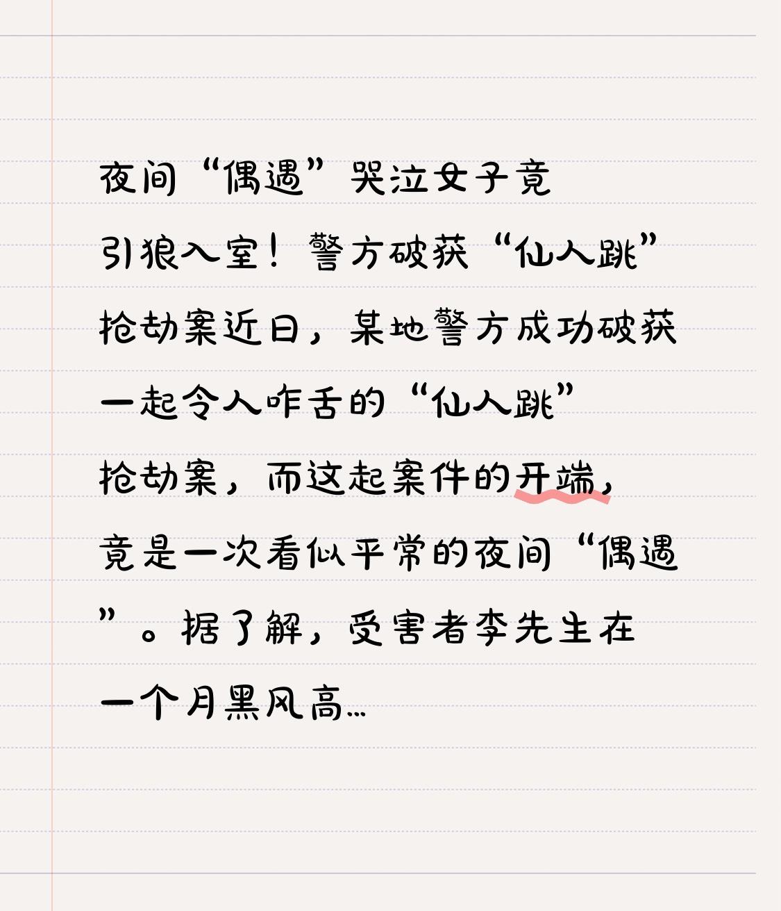 夜间“偶遇”哭泣女子竟引狼入室!警方破获“仙人跳”抢劫案近日,某地警方成功破获一起令人咋舌的“仙人跳”抢劫案,而这起案件的开端,竟是一次看似平常的夜间“偶遇”。 据了解,受害者李先生在一个月黑风高的夜晚驾车回家,途中遇到一名在路边哭泣的女子。善良的李先生心生怜悯,便停车询问女子是否需要帮助。女子哭诉自己与朋友走散,身无分文,希望李先生能载她一程。李先生没有多想,便让女子上了车。 然而,这看似暖心的救助却成了噩梦的开始。当车行驶到一处偏僻路段时,突然从路边跳出几名男子,将李先生的车团团围住。这些男子手持凶器,威胁李先生交出钱财。李先生惊恐万分,为了保命,只好交出了自己的钱包和手机。 得手后,这些劫匪迅速逃离现场。李先生冷静下来后,立即拨打了报警电话。警方接到报警后,高度重视,迅速成立了专案组展开调查。 通过调取案发现场周边的监控视频,警方发现了嫌疑人的踪迹。经过数日的艰苦侦查,警方终于锁定了犯罪嫌疑人的落脚点。在掌握了充分的证据后,警方果断出击,将犯罪嫌疑人一举抓获。 经审讯,犯罪嫌疑人交代,他们以女子在路边哭泣为诱饵,吸引善良的路人停车相助,然后实施“仙人跳”抢劫。他们分工明确,配合默契,已经作案多起。 警方提醒广大市民,在帮助他人时要保持警惕,避免陷入类似的陷阱。同时,如果遇到可疑情况,应及时拨打报警电话。此次“仙人跳”抢劫案的成功破获,彰显了警方打击犯罪的决心和能力,也为广大市民敲响了安全警钟。