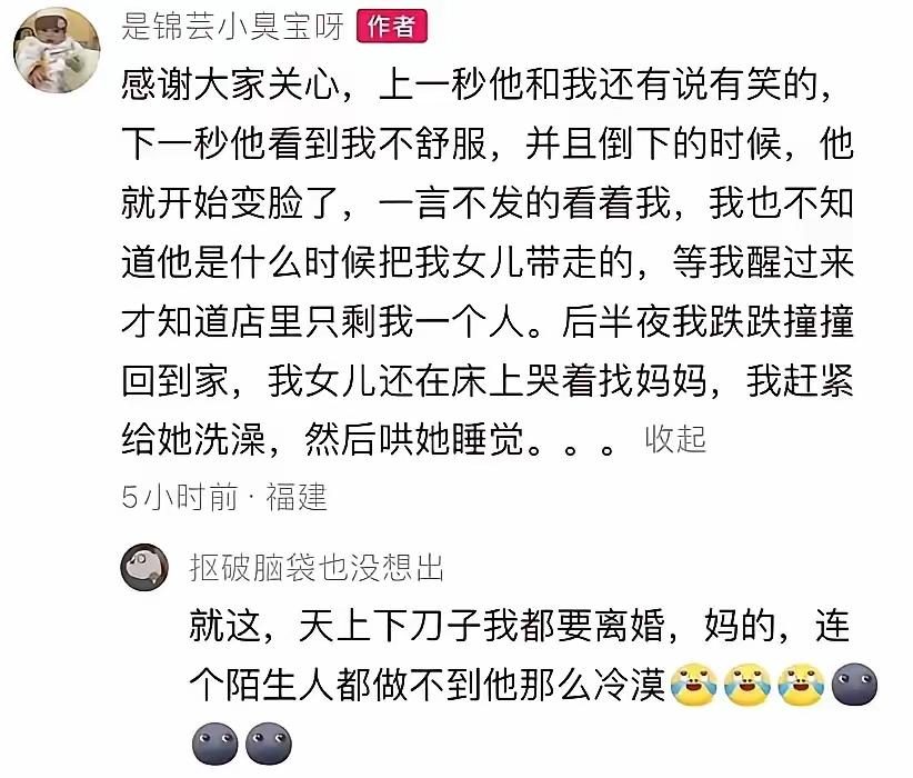 她老公任由她昏倒在地,毫无感情的从她身上跨过去,恶毒的想:“当时,男的想要是这样没了就好?”
