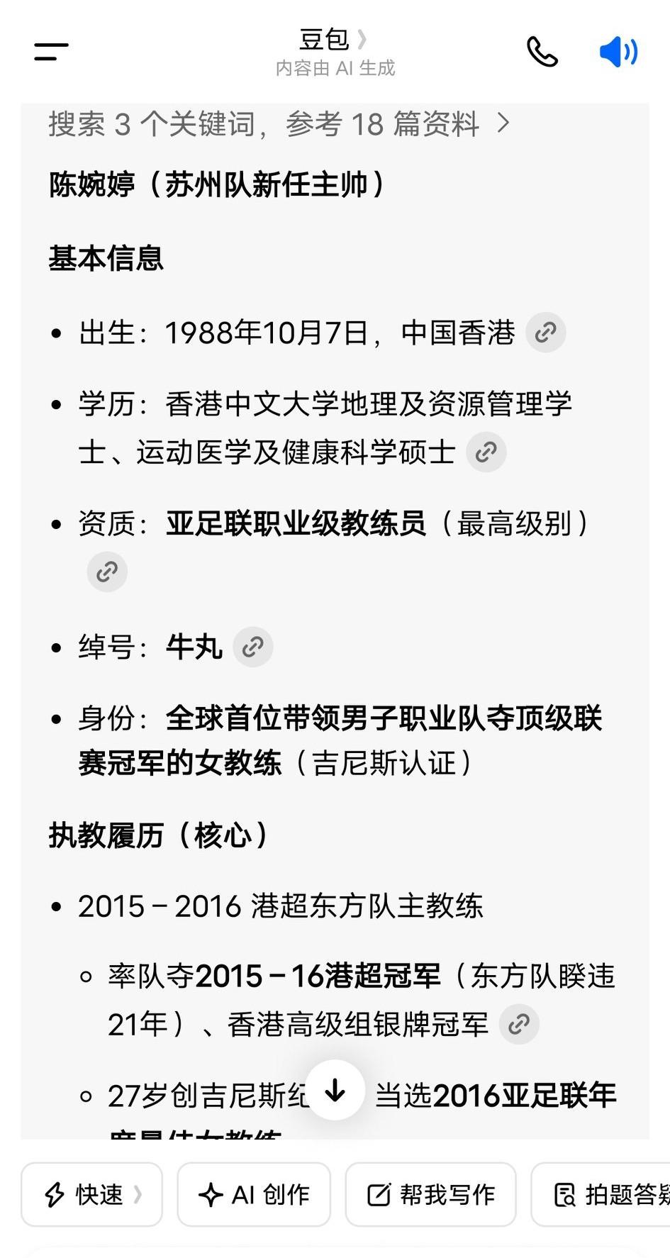 苏州队新任主帅陈婉婷赛前放出豪言:我们的任务是完成前4的目标…… 看了这位绰号叫“牛丸”的女教练的资料,说她是“全球首位带领男子职业队夺得顶级联赛冠军的女教练”,是一位学院派足球教练。当然,她为大家所熟知的是带领江苏女足夺得全运会冠军。 关于她为何会出任苏州队主教练的原因,她也是给出了一个非常有趣的理由:去年抢不到票,这次不用抢票了! 大家觉得苏州今年能杀入四强吗?