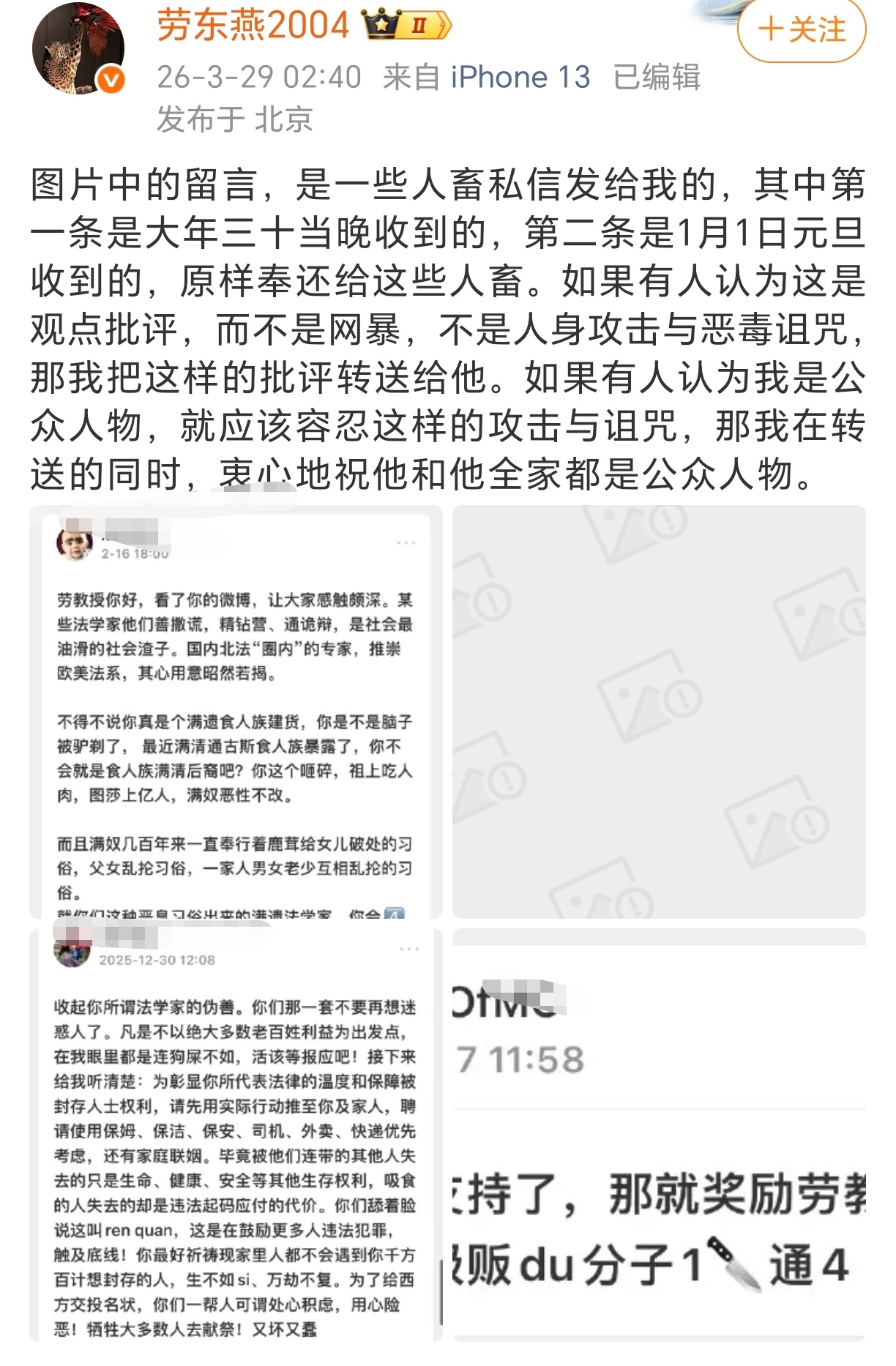 劳大教授深夜连续发文称自己受到网络暴力和人身攻击,会采取措施回击。