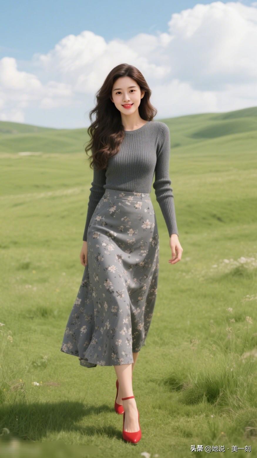 都市夜色下的优雅穿搭,黑色上衣配花卉长裙,手提包点缀,高跟鞋显气质。什么样的身材是完美身材