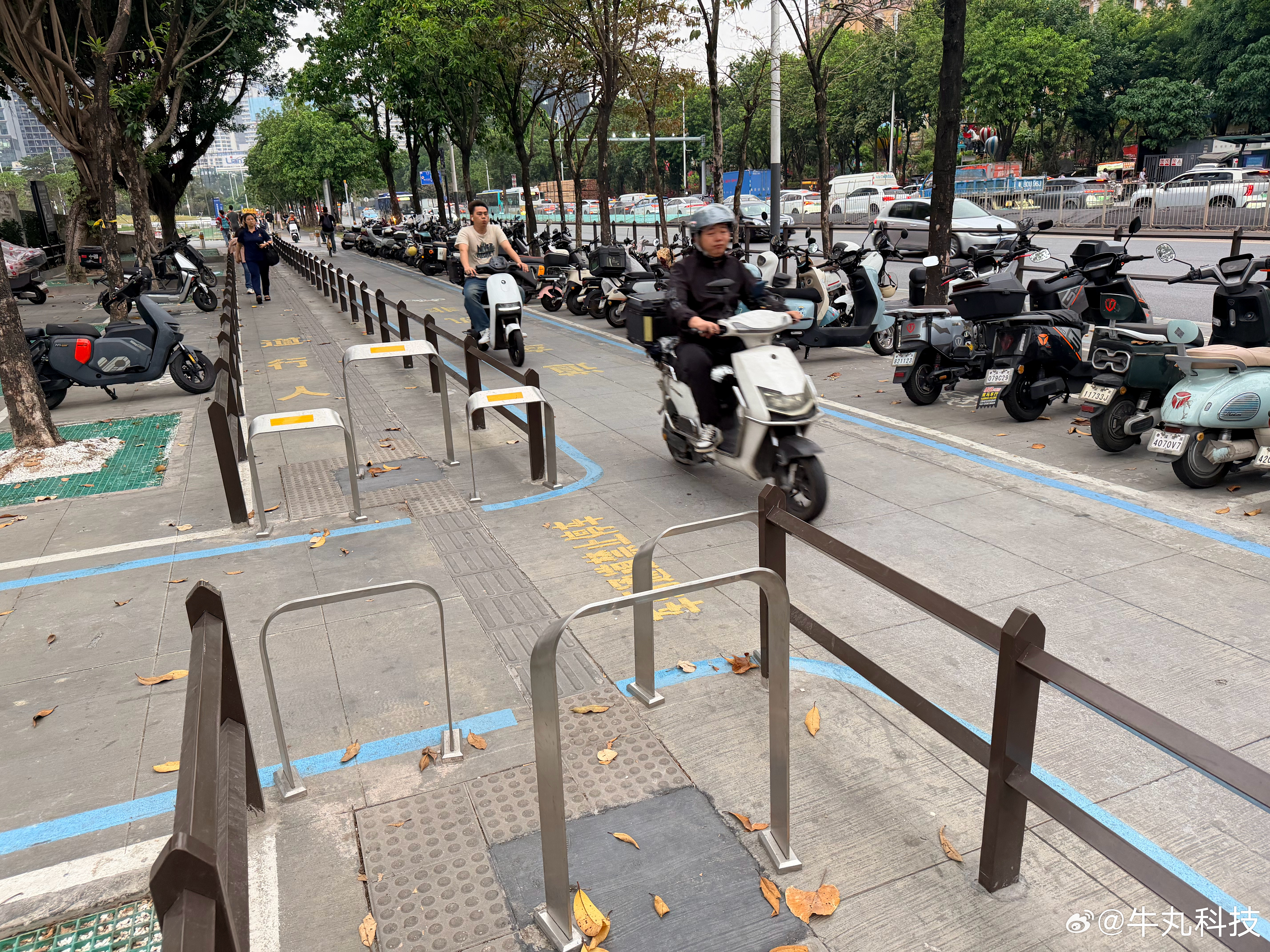 没想到没多久就拿出了实打实的解决方案,在主干道全面规划了电动车道、电动车停放区、人行道三分区,还用护栏和清晰的标线做了物理隔离,直接从根源上解决了机非混行、电动车占用步道的问题。