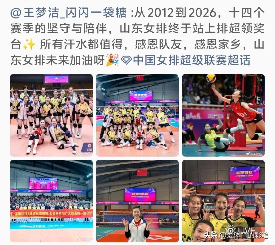拿联赛季军的王梦洁,笑得像吃凤梨一样甜,这成绩比拿世界冠军都令人激动开心[呲牙] 坚守14个赛季,王梦洁代表的山东女排成绩一直中下游,不是第七、就是第八,最差的第十,最好的第五,与奖牌一直无缘。 盼星星,盼月亮,终于盼来了奖牌争夺,还拿了队史首个季军,怎能叫人不欢喜啊。 三四名决赛首回合,她交出20次一传0失误,到位率和效率双90%,完美到位率40%的优秀答卷,王梦洁,这实力杠杠的,付出终有回报,她值得拥有季军[赞],期待国家队的她也能取得好成绩中国女排 王梦洁