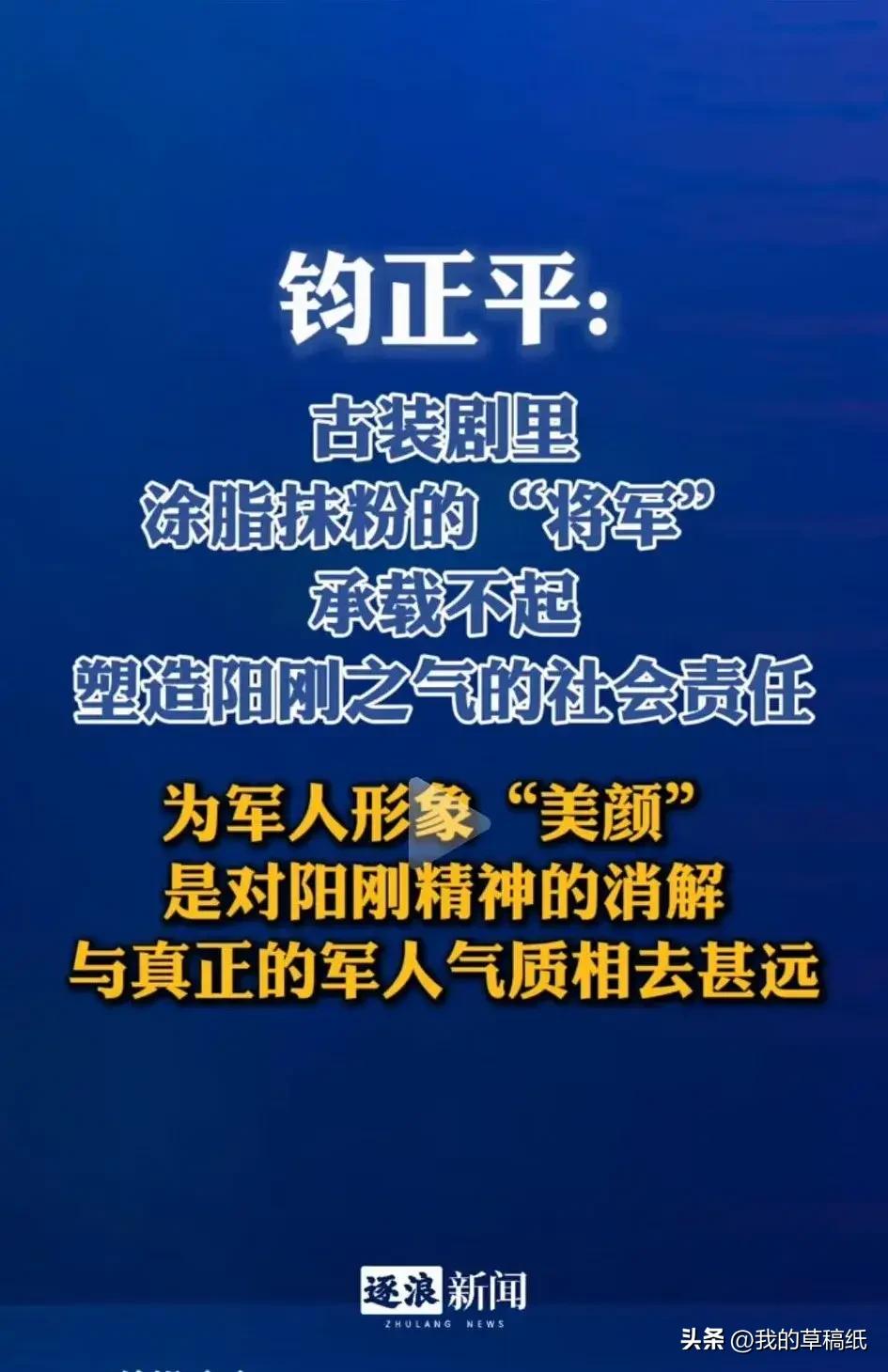 军号点名“粉底液将军”,真不是小题大做! 一个天天讲国防、讲军人的军号账号,不去评时事、不说军情,反倒揪着古装剧里的“粉底液将军”不放,不少人觉得太较真,至于吗? 其实一点不夸张。将军从不是摆拍的精致偶像,而是浴血沙场、保家卫国的脊梁。历史上的将领,是风吹日晒的糙汉,是铠甲沾血的硬汉,不是镜头前涂着厚粉底、眉眼柔媚的花美男。 钧正平骂的从不是某个演员,而是歪掉的审美。当荧幕上的将军只剩精致皮囊,丢了血性风骨,看多了的年轻人,会慢慢忘了什么是担当,什么是阳刚。 军人形象承载的是家国精神,不是流量审美。我们不反对多元长相,但战场从不是秀场,将军更不是爱豆。军号发声,不过是想守住一份该有的敬畏,别让脂粉气,盖过了保家卫国的浩然正气。
