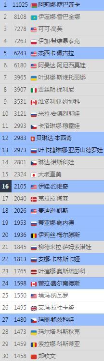 阳光双赛结束后, 最新一期WTA排名。 1,萨巴伦卡11025★ 2,莱巴金娜8108★ 3,高芙7278★ 4,斯瓦泰克7263★ ●网坛女子四巨头已成,积分均超7000。 5,佩古拉 6,阿尼西莫 7,斯维托丽娜 8,保利尼 9,姆博科 10,安德烈娃 ▼中国球员排名(前300) 30,郑钦文 34,王欣瑜 62,张帅 121,袁悦 137,朱琳 165,马烨欣 175,郭涵煜 188,王曦雨 232,高馨妤 247,尤晓迪 255,田方然 ▲亚洲女单实力排名: 2,莱巴金娜8108 15,大坂直美2324 30,郑钦文1458 34,王欣瑜1394 41,曾丽美1317 45,伊埃拉1255 62,张帅1031 72,普丁塞娃921 77,森梅兹891 81,内岛萌夏863