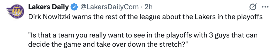 诺维茨基向其他球队发出关于季后赛湖人队的警告:“一支拥有三名能够决定比赛、并在关