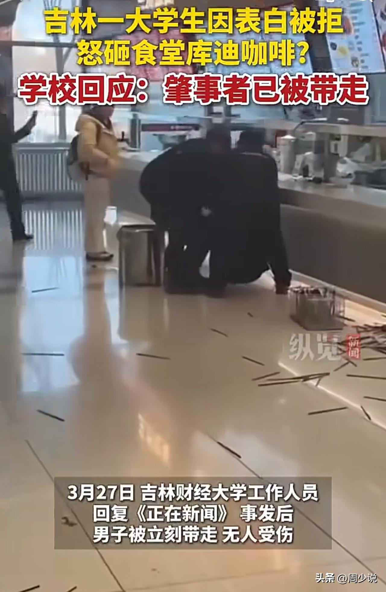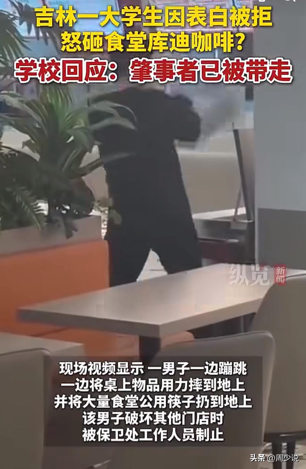 “表白失败就撒泼毁公物?”吉林某高校内,一幕荒唐场景让不少师生大跌眼镜。一名男大学生鼓足勇气向心仪女生表白,不料被当场拒绝,没成想下一秒,他直接情绪崩溃,在学校食堂里发起了火,全然不顾周围同学的目光,抓起食堂里的公用筷子,一把把狠狠扔在地上,筷子散落得到处都是。 情绪上头的他,还把怒火对准了食堂的设备,径直冲向一旁的咖啡机,一番打砸后,这台价值近10万元的机器彻底损毁,现场一片狼藉。 事发后,学校工作人员第一时间赶到现场,将情绪依旧不稳的男生带走处理,好在这场闹剧里,没有同学因此受伤。 此事传到网上,很快引来网友热议。有网友直言:“这点挫折都扛不住,将来走进社会可怎么办?玻璃心也太严重了。” 也有网友感慨:“表白被拒是常事,用破坏公物来发泄,既违法又丢了体面,实在不值当。” 还有网友表示:“看着是冲动,其实是骨子里缺乏情绪管理的能力,高校真的该多重视这方面的引导。” 在周少看来,类似大学生因小事情绪失控的事,并非个例。如今不少年轻人,从小在顺境中成长,面对拒绝、失败这类负面事件时,大多不太懂得如何疏导情绪。 这起事件看似只是一场冲动的闹剧,背后却藏着不容忽视的教育痛点。我们常说要教孩子学习知识、追求优秀,却常常忽略了情绪管理这门必修课。 被拒绝本是人生常态,不是所有人都能事事如愿,遇到不顺心就用极端方式发泄,不仅要为自己的行为承担经济、纪律责任,更暴露了心智的不成熟。 可见,比起学业成绩,教会孩子接纳挫折、掌控情绪,才是更重要的教育课题。高校和家庭,都该多给年轻人一些情绪疏导的引导,让他们在面对失意时,能多几分理智,少一些莽撞,这才是真正意义上的成长。#周少说教育# #寻美三湘#