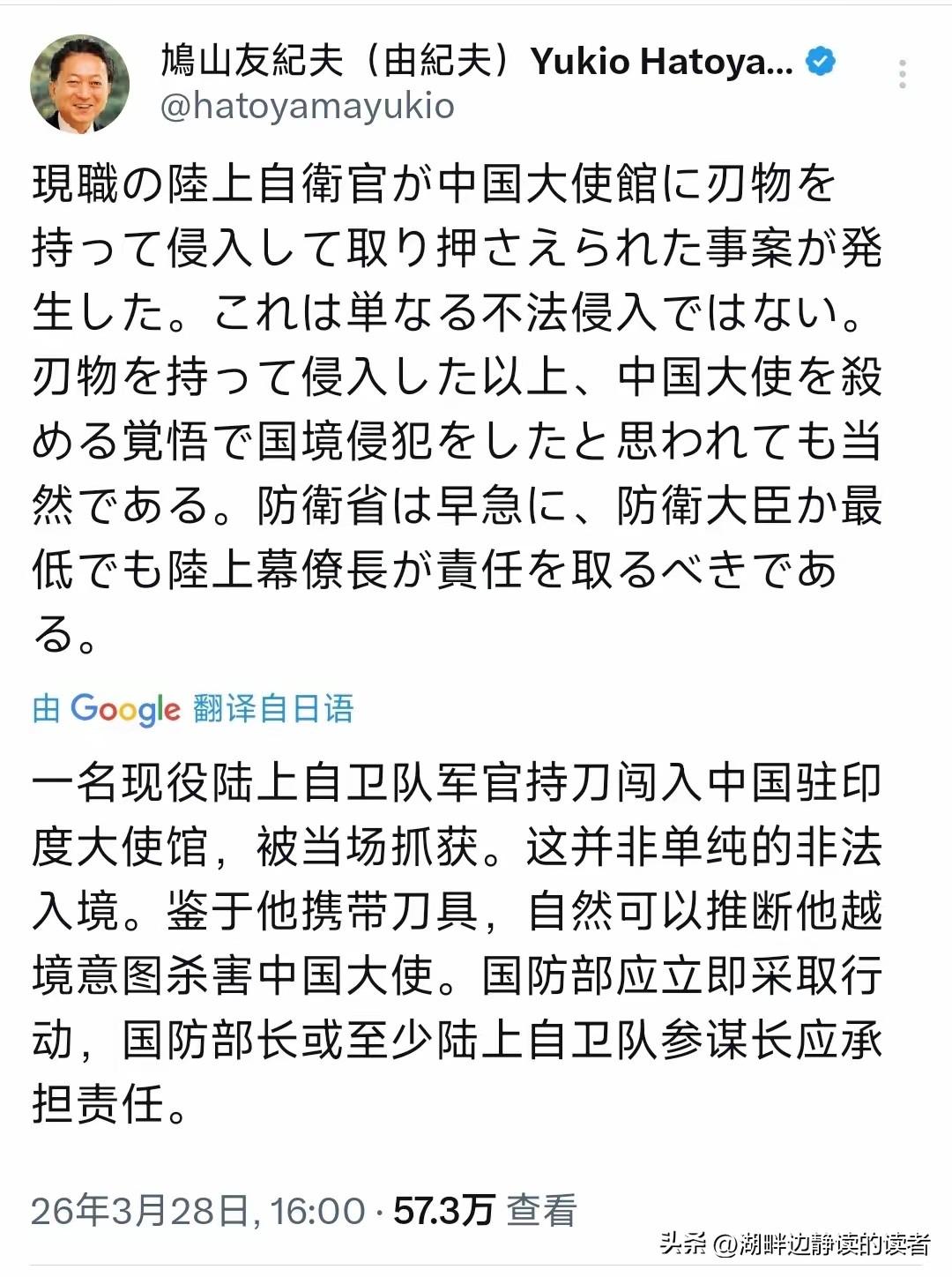 日本前首相鸠山由纪夫昨天(3月28日)写道:“一名现役陆上自卫队军官持刀闯入中国驻日本大使馆,被当场抓获。这并非单纯的非法入境。鉴于他携带刀具,自然可以推断他越境意图杀害中国大使。防卫省应立即采取行动,防卫大臣或至少陆上自卫队参谋长应承担责任。” 涉事男子为23岁陆上自卫队三等陆尉村田晃大,携带18厘米长刀具,提前踩点后翻墙闯入使馆区域,当场扬言要杀害中方外交人员,性质极其恶劣。 《维也纳外交关系公约》明确规定外国使馆享有不可侵犯权,现役军人持械闯馆、意图行凶,已经突破外交底线与国际法基本准则。 日本政府初期仅以“遗憾”轻描淡写回应,首相官邸、防卫省迟迟未正式道歉,对安保漏洞与人员管控失责问题刻意回避。 鸠山由纪夫长期主张中日友好、正视历史,此次公开发声直指事件本质,要求高层问责,体现出日本政界少数清醒人士的担当。 防卫省对现役军人思想教育严重缺失,极端右翼思潮在自卫队内部蔓延,类似恶性事件绝非偶然,而是长期失管的必然结果。 日本警视厅直至3月29日才对嫌疑人驻地及住所展开搜查,前期调查拖沓敷衍,暴露出日方对涉外安全事件的消极态度。 历史上曾发生日本极端分子刺杀清朝外交使臣的恶性事件,如今现役军人重演类似行径,军国主义回潮风险值得高度警惕。 中方第一时间提出严正交涉,要求日方彻查真相、严惩肇事者、杜绝类似事件,切实保障中国外交机构与人员安全。 日本国内右翼媒体刻意淡化事件严重性,煽动对华对立情绪,误导民众认知,进一步加剧地区关系紧张氛围。 自卫队军官明知使馆为神圣不可侵犯的外交场所,仍蓄意持刀闯入,说明其主观恶性极强,绝非临时起意的个人行为。 日本防卫大臣与自卫队高层负有不可推卸的管理责任,放任军人滋生极端思想,已经构成严重的职务失职。 国际社会纷纷对此事件表示关切,认为日方必须给出合理解释,否则将严重损害日本的国际信誉与外交形象。 此次事件给中日关系造成新的冲击,日方若不彻底整改、严肃追责,两国互信将进一步受损,地区稳定也将面临威胁。 鸠山由纪夫的发声戳破日方敷衍姿态,唯有正视问题、全面整改、真诚道歉,才能挽回信任,避免事态进一步升级。大阪持刀伤人 我驻日大使 日本大使访华 日本涉华事件 麻烦看官老爷们右上角点击一下“关注”,既方便您进行讨论和分享,又能给您带来不一样的参与感,感谢您的支持! 各位读者你们怎么看?欢迎在评论区讨论。