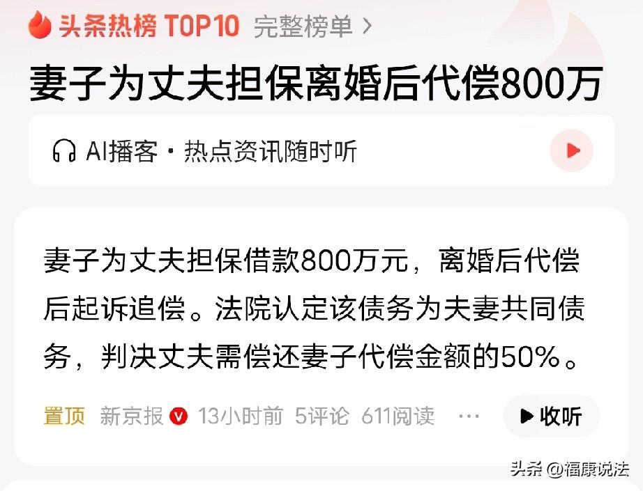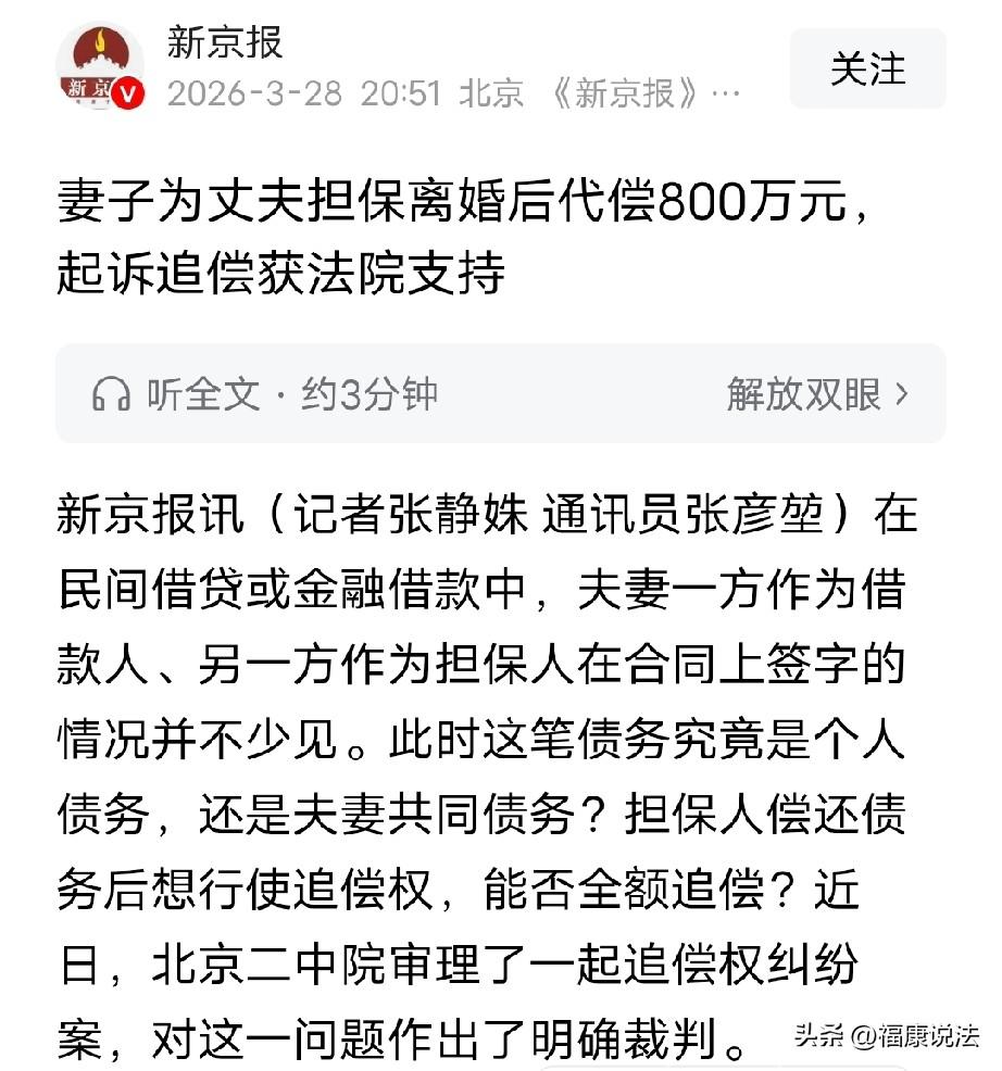 北京,女子婚姻存续期间,丈夫向银行借款300万,她作为担保人,把名下房子做了抵押,不料,丈夫没按时还款,女子凑了800多万把贷款、利息、罚息全部还清,二人离婚后,女子越想越亏,将前夫告上法院,要全额追偿800万余元,法院认为:这笔钱属于夫妻共同债务,最终,这样判了。 2002年,易先生和温女士成了家,2017年又离了婚,本来以为终于能甩开过去的糟心事儿,各自轻松过新生活了,没曾想十年前的一笔借款,二人上了法院,这次做个彻底了结。 时间拉回2011年,当时两人还没离婚,易先生因为做生意需要钱,找银行借了300万。 签合同的时候,易先生是借款人,温女士在担保人那栏签了字,还把自己名下的房子做了抵押担保。 那时候温女士心里还琢磨呢,都是两口子,他做生意也是为了这个家,帮衬一把是应该的,哪能想到这是给自己挖了个大坑。 银行在2013年把300万打给了易先生,可后来易先生没按时还钱,银行没办法,就申请了强制执行。 那阵子温女士天天愁得睡不着,生怕自己的房子被收走,日子过得提心吊胆的。 2023年,温女士凑了800多万,把这笔连本带息加罚息的债务全还上了。 当时她心里一块大石头总算落了地,寻思着这下彻底清净了,再也不用被这事缠得头疼了。 可自从两人离婚后,温女士越想越气,胸口就像堵了块大石头,凭啥啊?钱是他借的,凭啥最后全落到自己头上? 这口气实在咽不下,于是把前夫易先生告上了法庭,想要全额追偿这800万,不然这日子过得太憋屈了。 法庭上,两人各说各的理。易先生说,这笔钱是用来还婚内房子贷款的,属于夫妻共同债务,应该两人平摊。他心里还打着小算盘呢,能少出点是点,凭啥让自己一个人扛。 温女士却觉得,自己只是担保人,钱是易先生借的,理应由易先生全部承担,自己替他还了钱,有权要回全部。 那么,温女士能要回这笔钱吗? 温女士本来以为自己只是担保人,替前夫还了钱就能全额要回来,但法院没支持。 《民法典》第106四条规:夫妻双方共同签名或者夫妻一方事后追认等共同意思表示所负的债务,以及夫妻一方在婚姻关系存续期间以个人名义为家庭日常生活需要所负的债务,属于夫妻共同债务。 因为这笔钱是在两人没离婚的时候借的,而且是用来还婚内房子的贷款,属于一起花了的钱,就算签合同的时候温女士是担保人,但本质上属于夫妻共同债务。 所以,这笔钱,得两人一起平分,温女士只能要回自己多付的那一半。 法院认为,温女士作为担保人签字,说明她对这笔钱是知情的。 再加上有证据显示,300万确实是用来还两人婚内买的房子贷款,属于为家庭生活花的钱,所以,这笔债是夫妻共同债务,两人都有责任还。 但因为两人离婚的时候,没说清楚这笔债谁来还,因此留下了麻烦。 其实,很多人离婚的时候只想着分房子分存款,忘了说清楚之前欠的钱该谁来还,事后很容易扯皮。 如果,能提前写进离婚协议里,就不会闹到法院了。就算没写,真到打官司这一步,法院一般会根据实际情况,要么判一人一半,要么看谁花得多谁承担得多。 但是,温女士还了全部的800万余元的债务,多还了属于易先生的那一半,所以,她有权找易先生要回来。 最终,法院判决:易先生得还给温女士400多万。 听到判决结果,温女士心里还是有点堵,但好歹讨回了一半,总比全打水漂强;易先生虽不情愿,却也没法反驳,只能认头。 这事也给大伙提了个醒,夫妻之间帮着担保借款可得谨慎,哪怕离婚了,要是被认定是共同债务,该承担的责任跑不掉。 真到了追偿这一步,也得讲证据,法院会根据实际情况来判,不是想全额要回就能全额要回的。 大伙可得擦亮眼睛,担保也要谨慎,别像温女士似的,事后拍大腿、后悔都晚了。