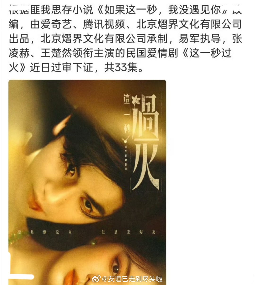 张凌赫、王楚然这一秒过火过审下证因为主演太好看路透开始出圈,匪我思存原书打底,至少热播打底吧,如果和玉簟秋 能对打就更有话题性了