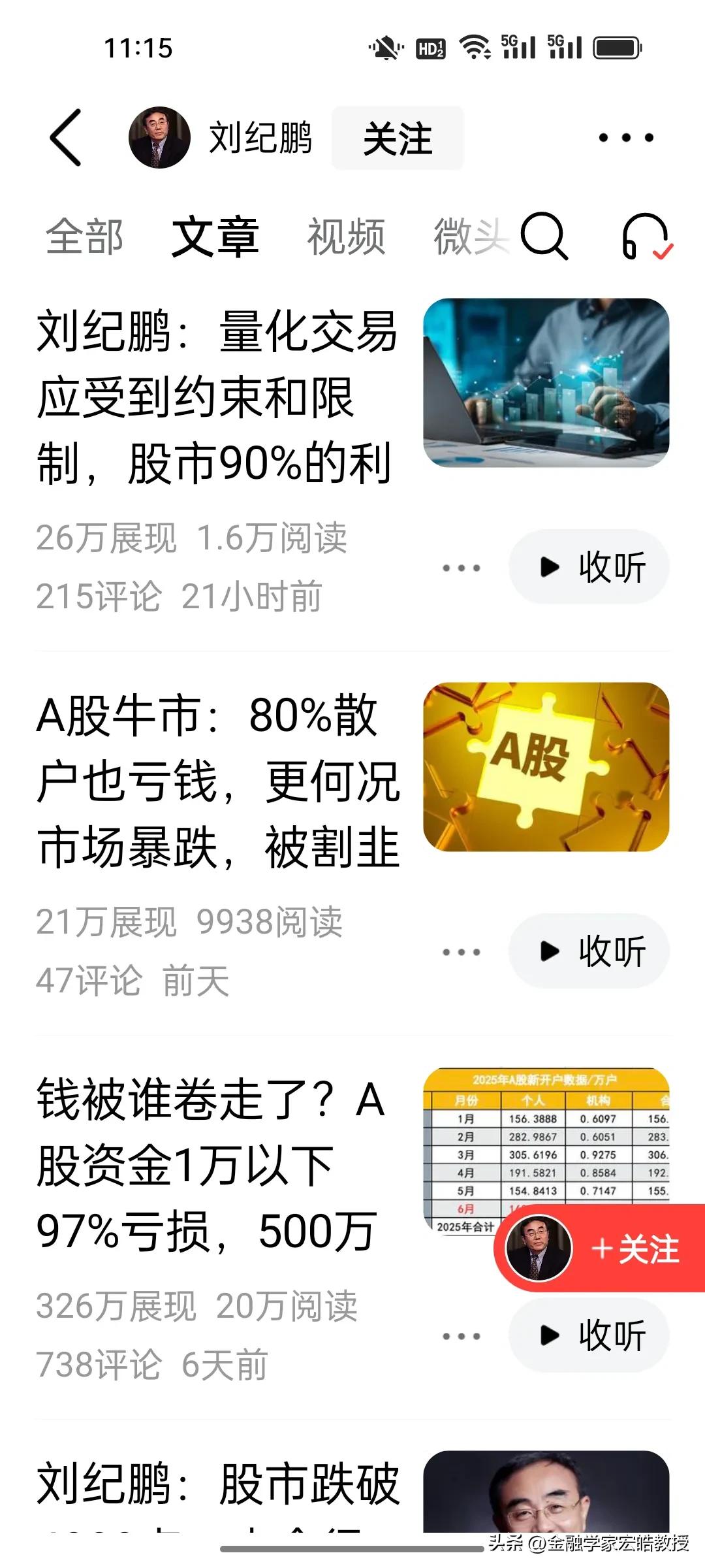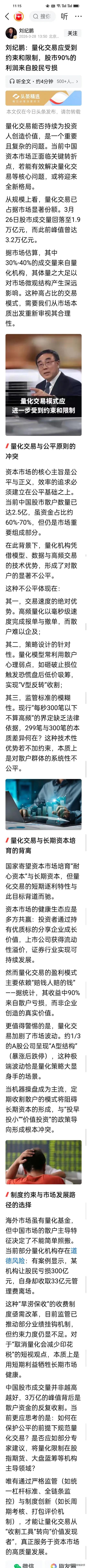 刚刚看到刘继鹏教授再次炮轰量化,一句“量化90%的利润来自股民亏损”让人振聋发聩。市场3万亿成交量竟是散户收割机? 刘继鹏教授最近真的是为呼吁量化改革操碎了心,近期连发多篇文章,直指量化交易是A股的“吸血虫”:当前30%-40%的成交量来自量化机构,3.2万亿峰值成交量的背后,不是市场繁荣,而是对散户资金的反复收割。 他直言,股市90%的利润来自散户亏损,这种“赚快钱不创造价值”的模式,与国家培育“长钱长投”的目标严重不符。 刘继鹏教授这篇文章的一个新观点值得深思,那就是高成交量不再是牛市信号,而是量化高频交易制造的虚假繁荣。如今我们不能再以大盘全天成交量作为判断市场转好或者转弱的唯一标准。 当机器收割成为主流,长期价值投资只会被边缘化,保险等机构的这些长钱要赚钱也会变得困难重重。A股要现真正的健康生态,量化制度改革已迫在眉睫!